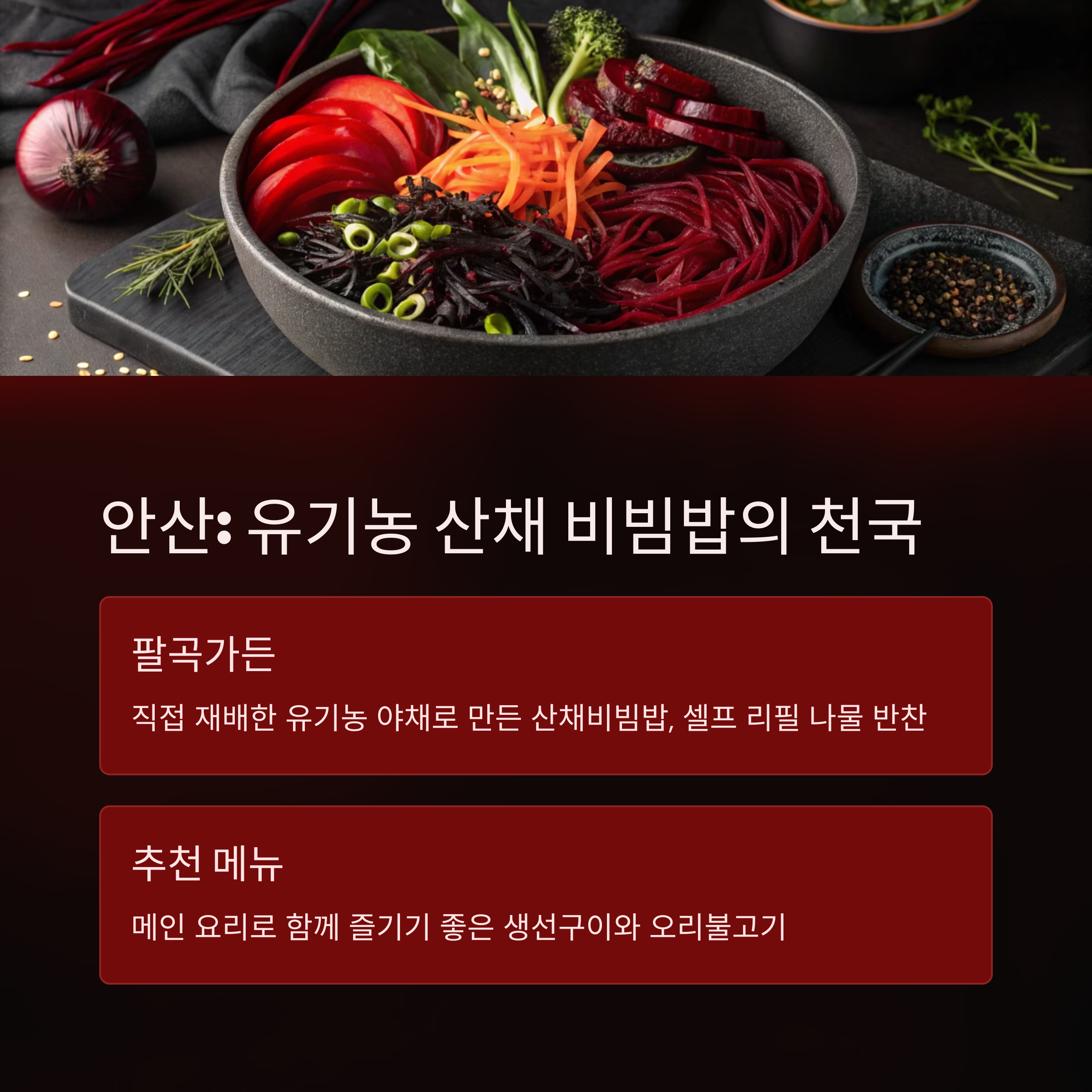 안산에서는 직접 재배한 유기농 야채를 사용하여 만든 산채 비빔밥을 즐길 수 있습니다.