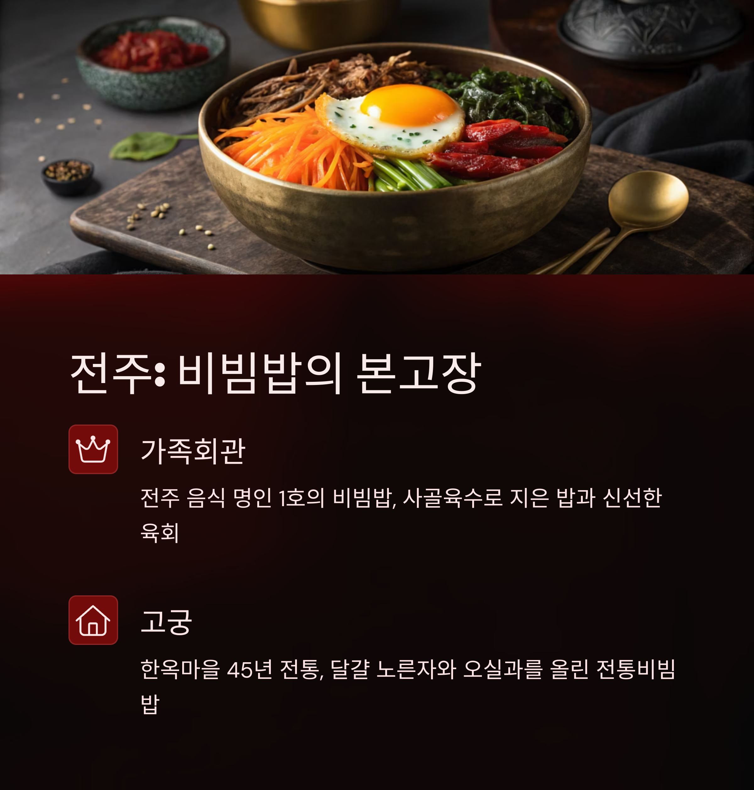 전주는 비빔밥의 본고장으로, 전통적인 재료와 정성스러운 조리법으로 유명합니다.