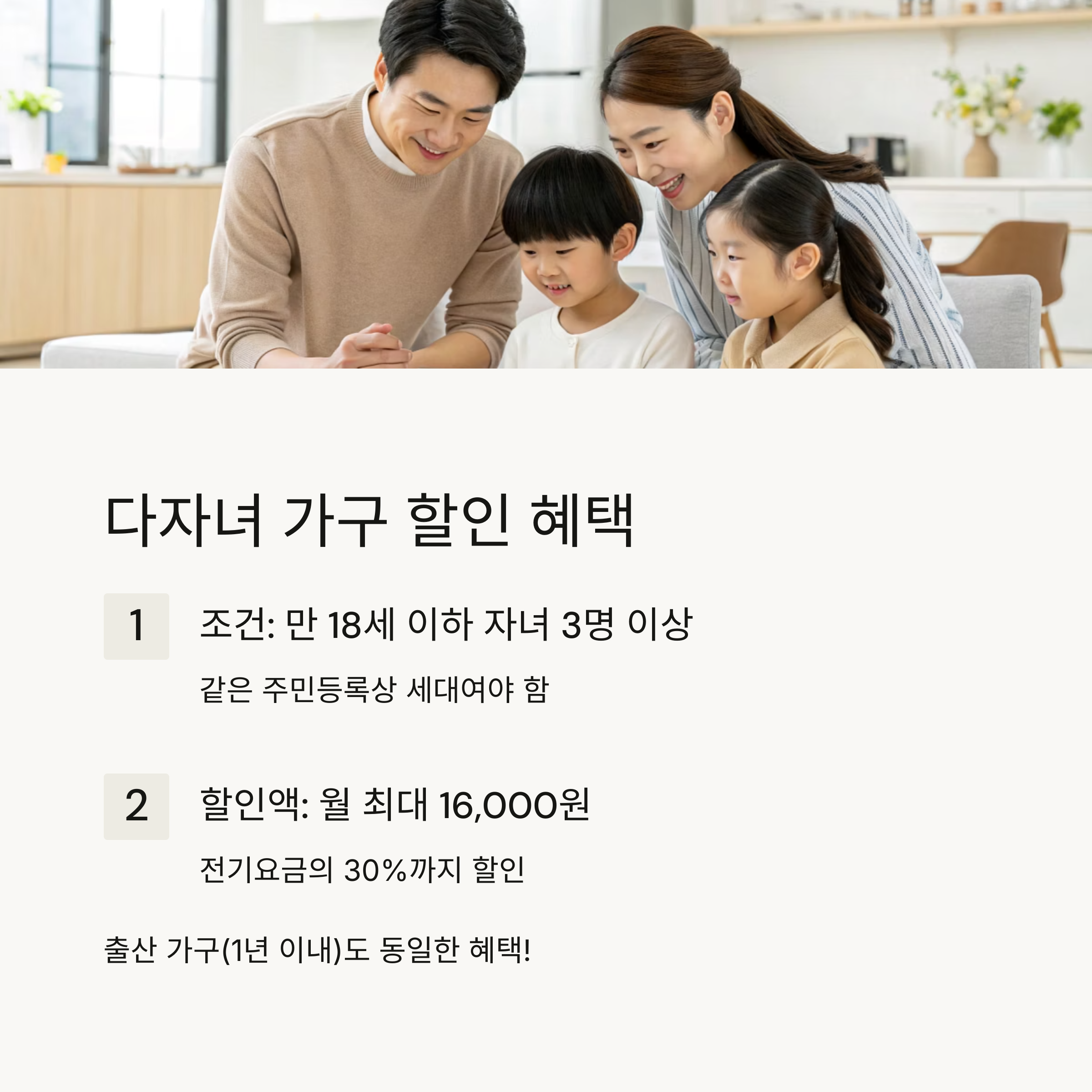 | 3자녀 이상 (미성년 기준) | 월 전기요금의 최대 30%, 최대 16,000원 할인 적용 |