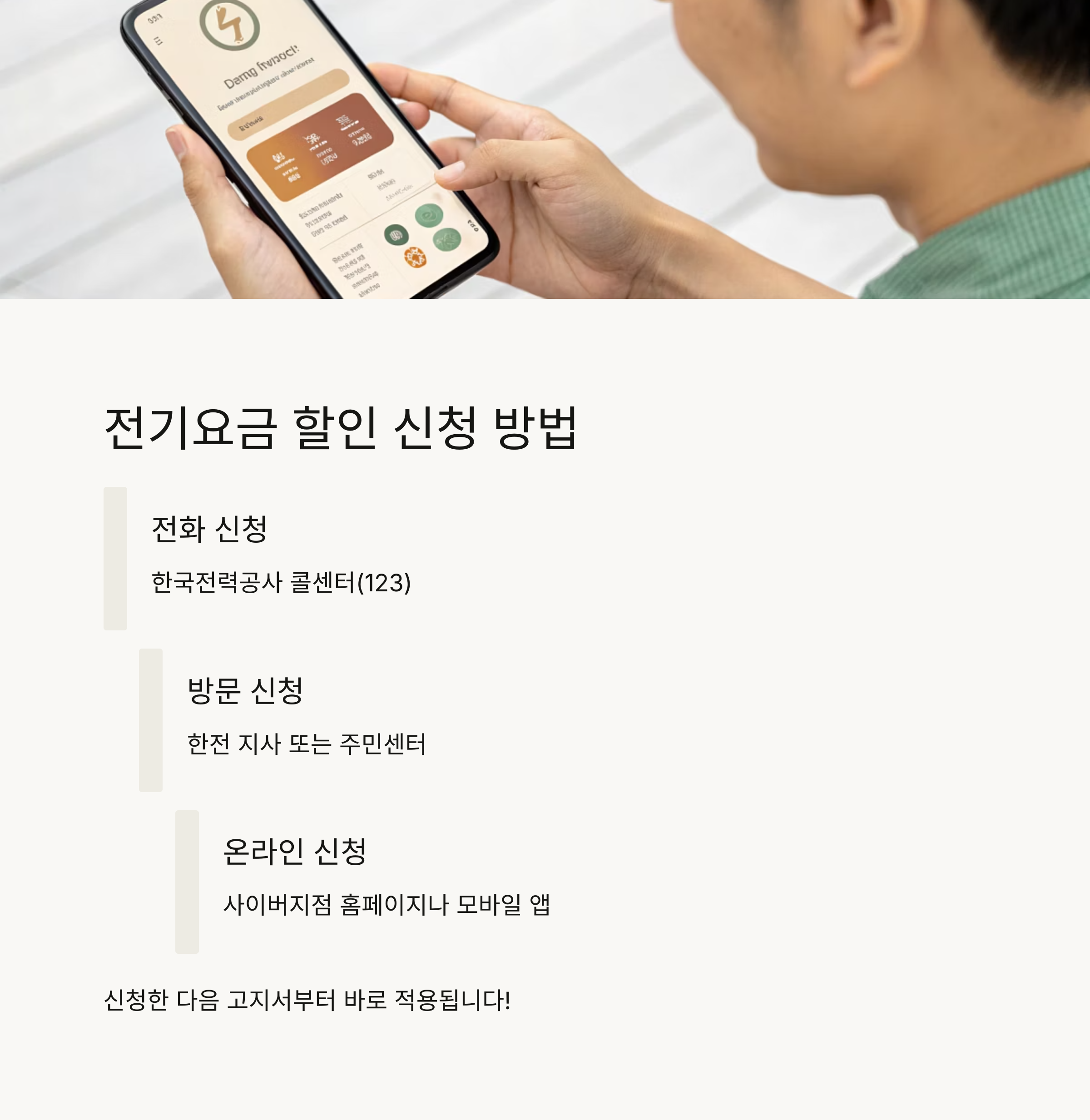- 한전 지사 방문 또는 주민센터 신청 대행
