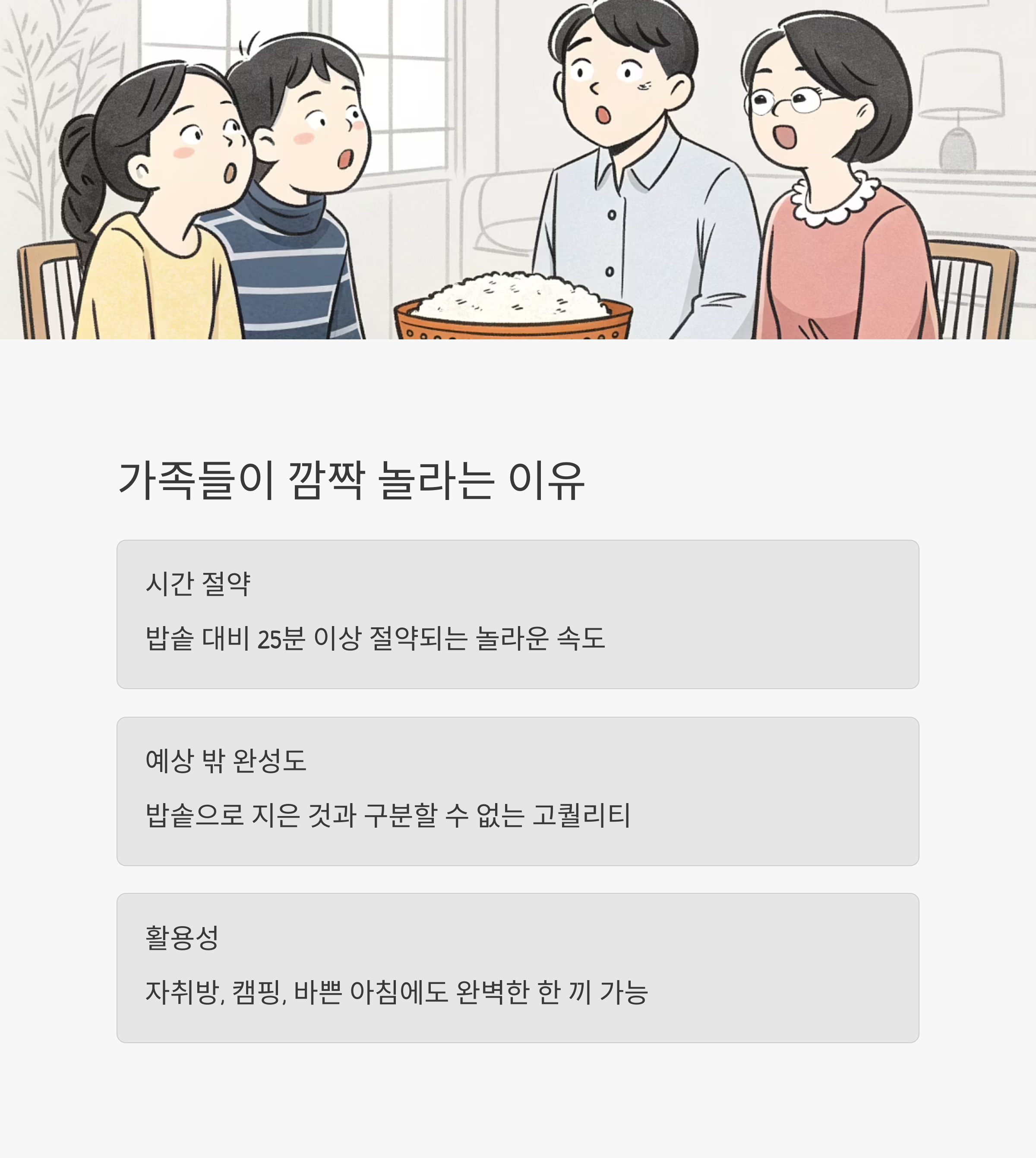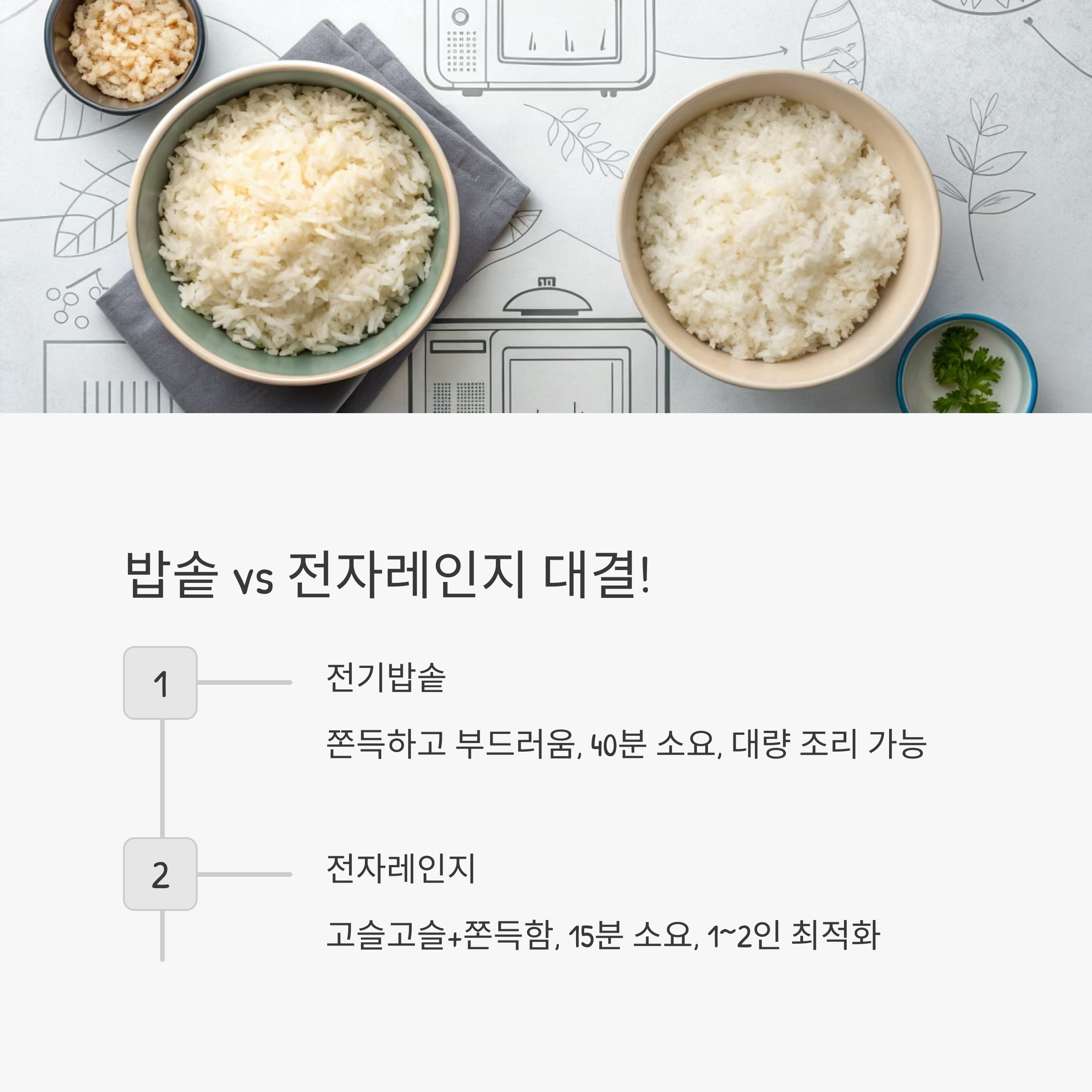 | 전자레인지 | 고슬고슬+쫀득함 | 약 15분 | 속도 빠름, 1~2인용 최적화 |