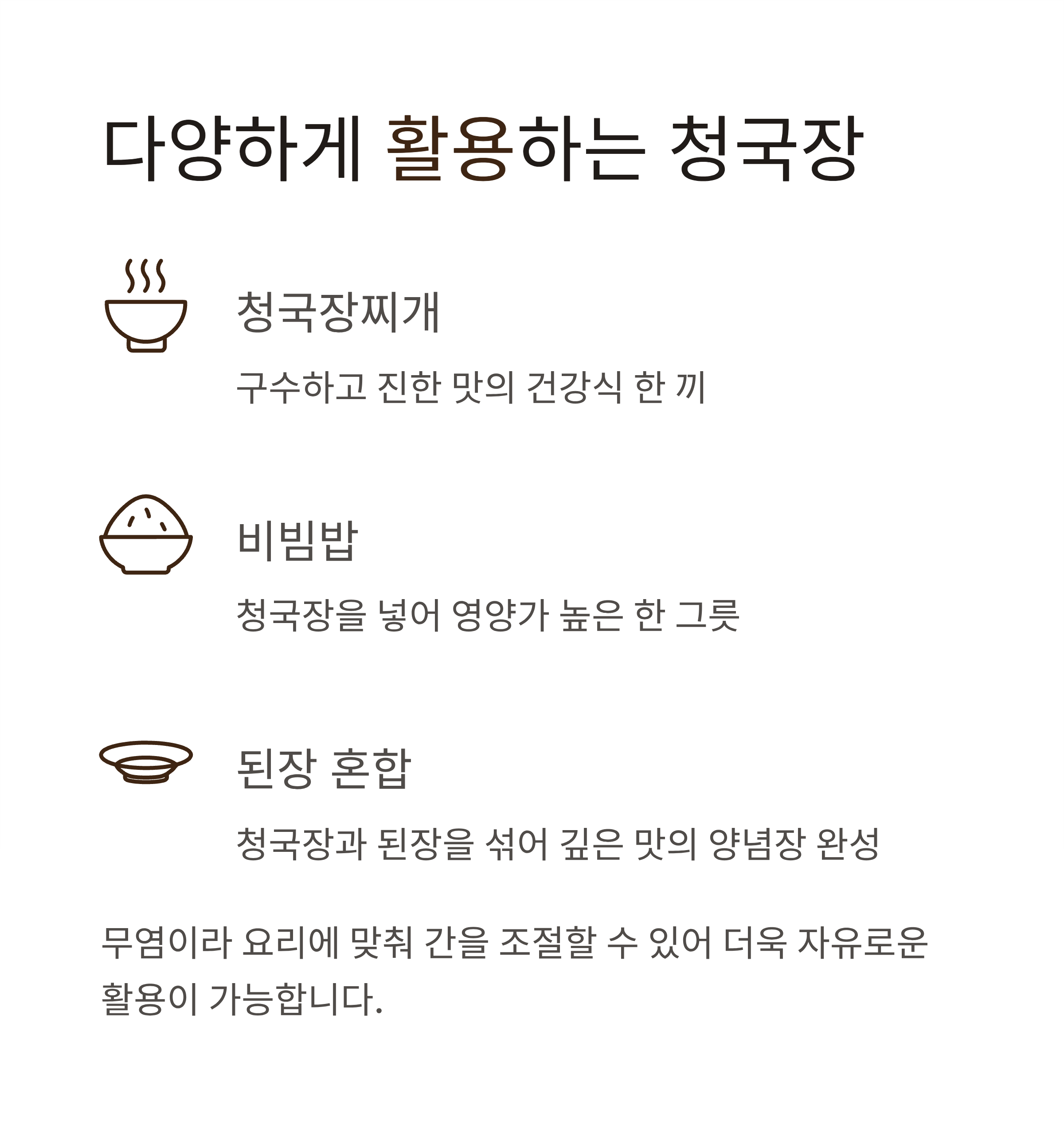 청국장찌개, 비빔밥, 된장과의 혼합 요리 등