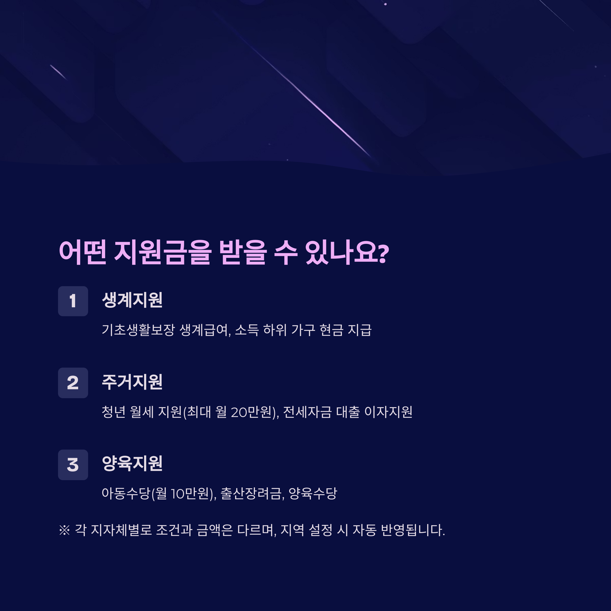 ※ 각 지자체별로 조건과 금액은 다르며, 보조금24에서 지역 설정 시 자동 반영됩니다.