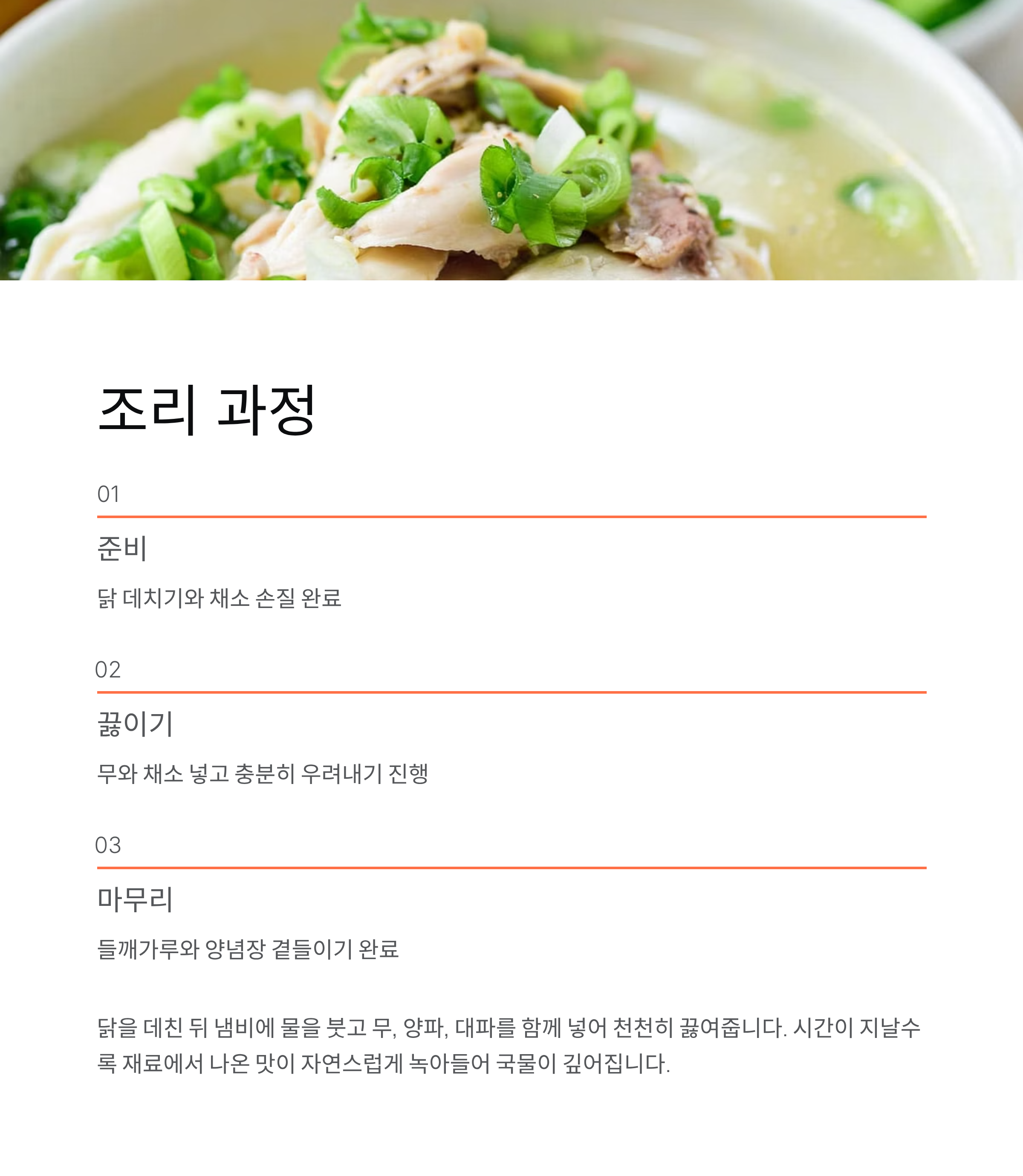 부드러운 닭과 달큰한 무, 향을 채워주는 대파가 어우러지니 자극적이지 않으면서도 포근한 온기가 느껴지는 맛이 됩니다. 환절기처럼 변덕스러운 계절에 부담 없이 즐기기 좋은 한 끼가 되었어요.