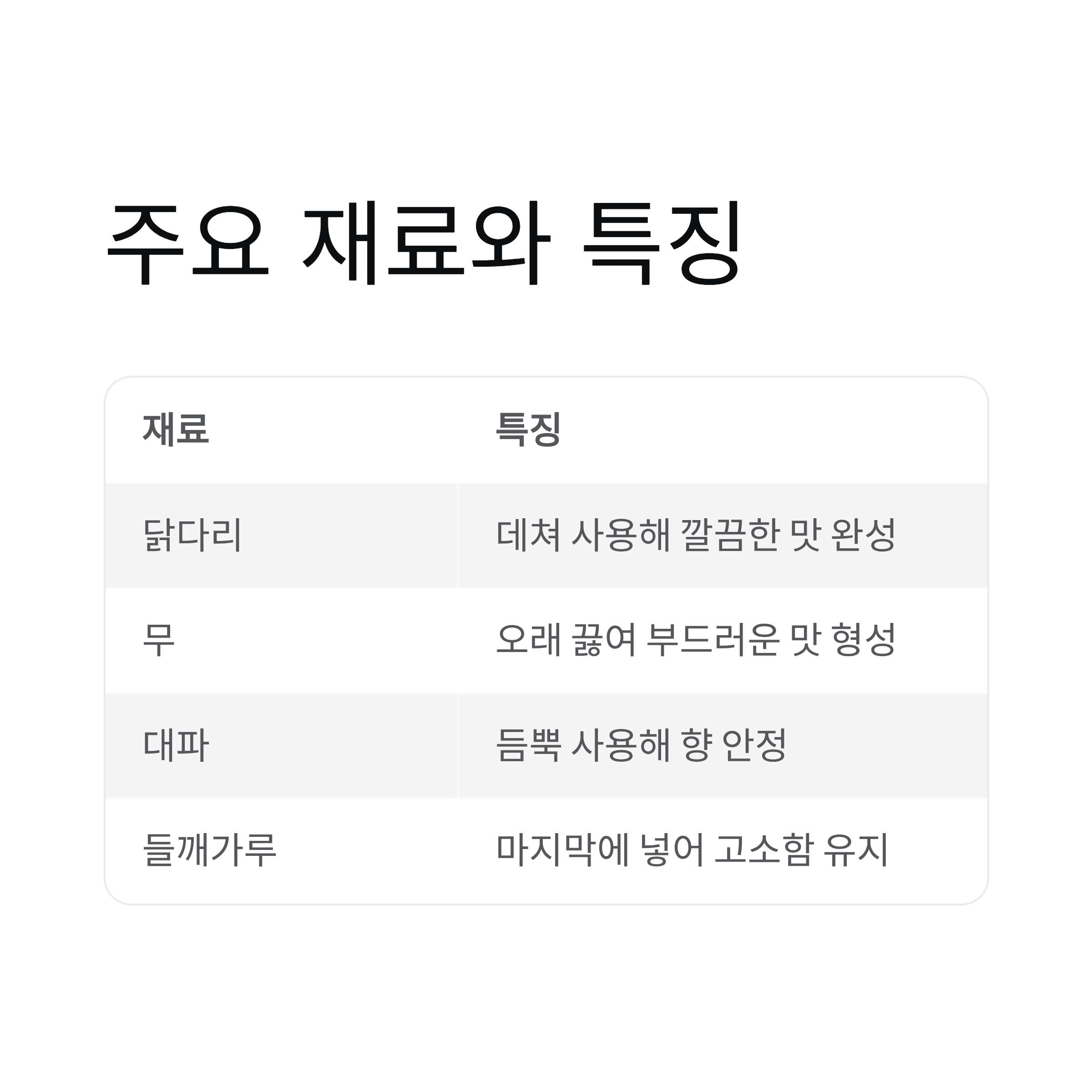 | 닭다리 | 데쳐 사용해 깔끔한 맛 완성 |