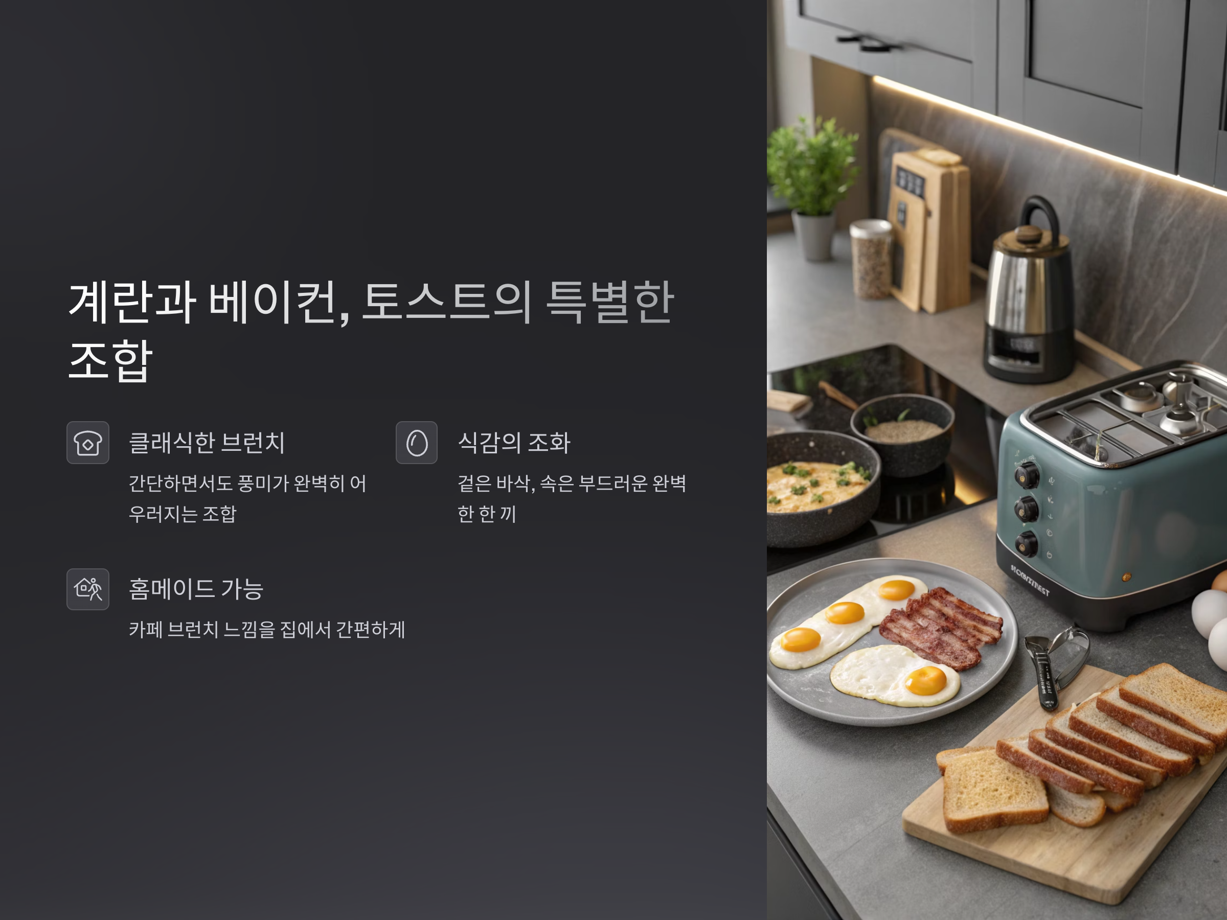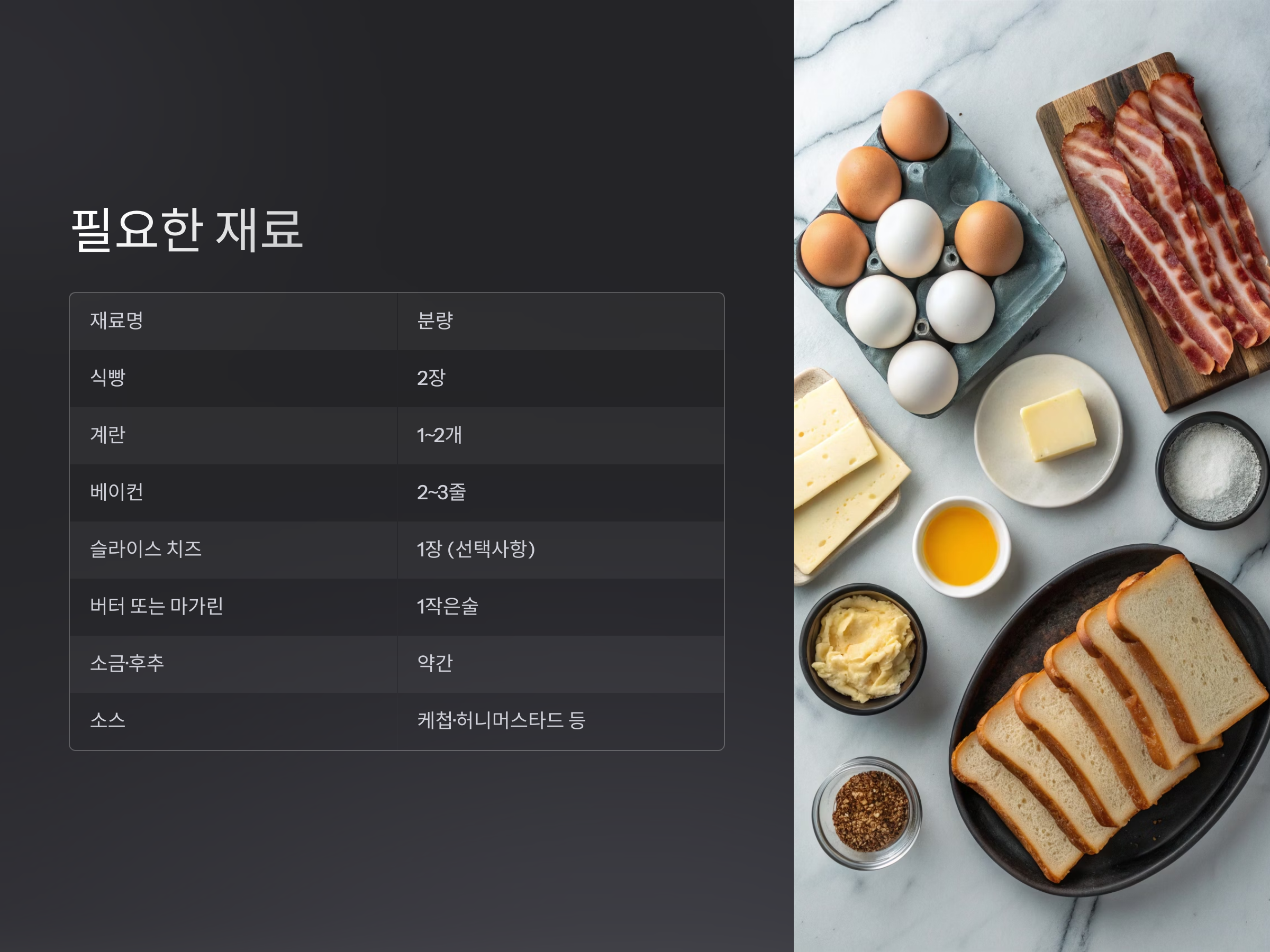 계란과 베이컨, 그리고 식빵의 조합은 간단하면서도 풍미가 완벽히 어우러지는 클래식한 브런치 메뉴입니다.