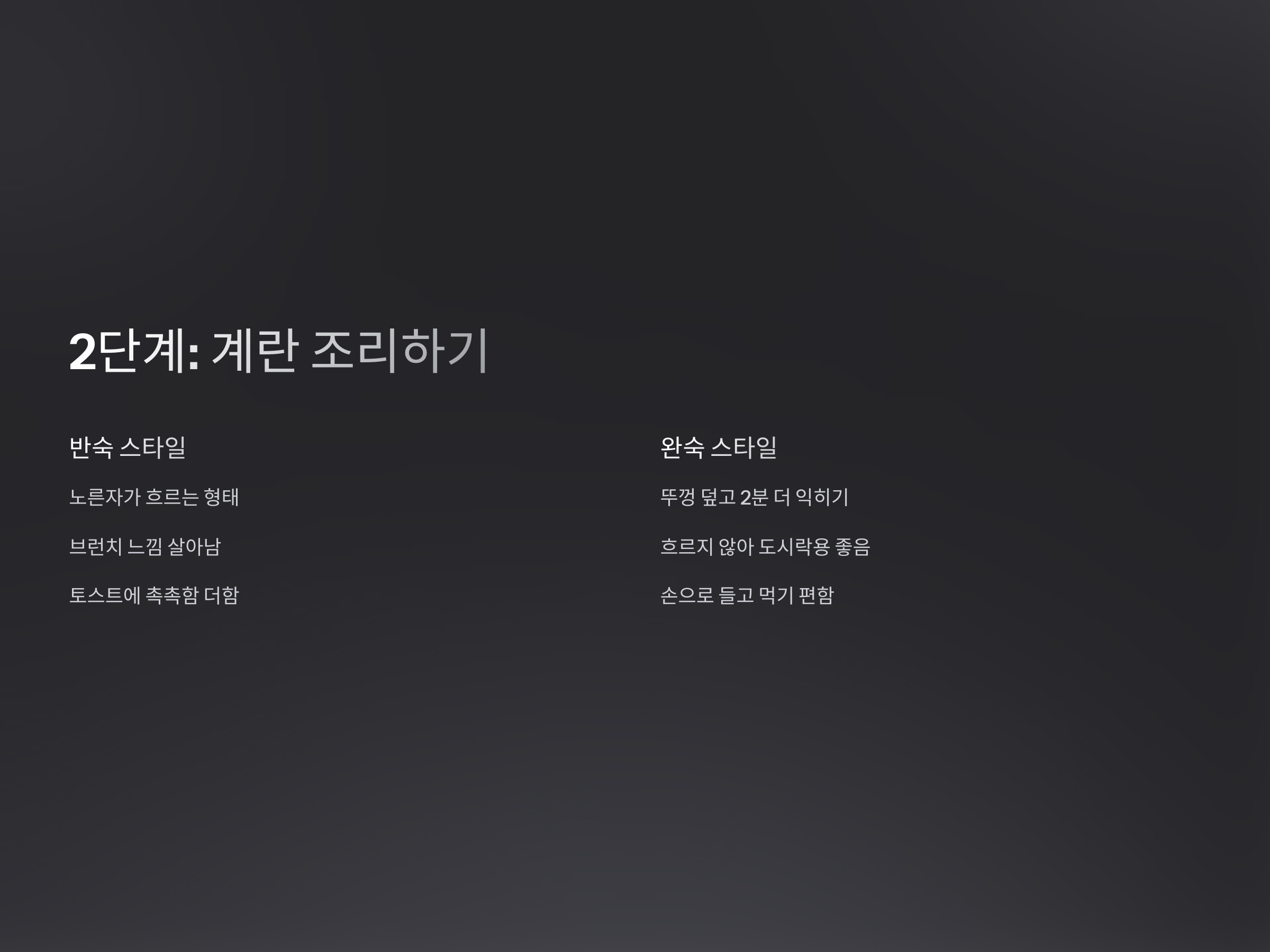 완숙을 원할 경우, 뚜껑을 덮고 중불에서 2분 정도 더 익히면 속까지 촉촉한 형태로 완성됩니다.