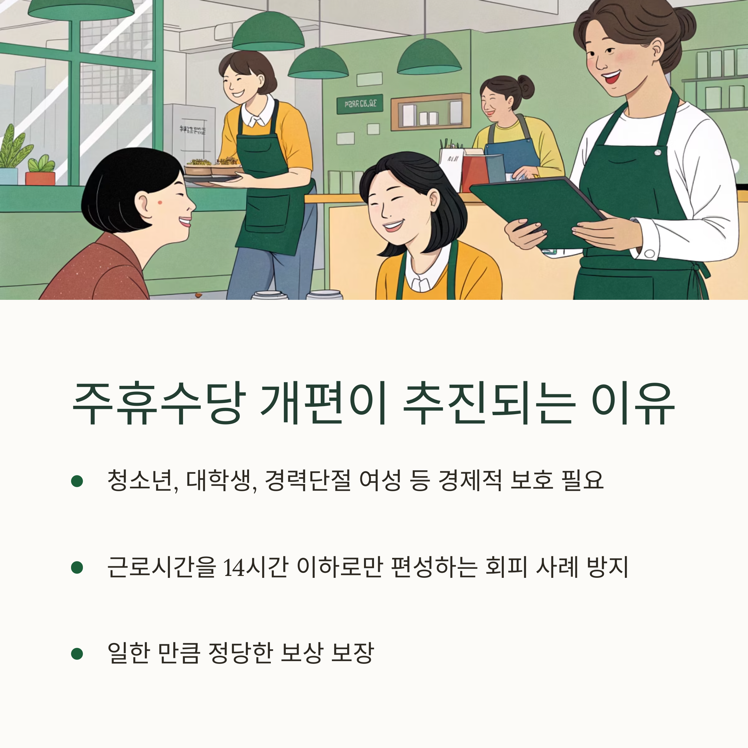 주 15시간 미만 근로자들은 청소년, 대학생, 경력 단절 여성 등 경제적 보호가 필요한 계층이 많습니다. 이들을 보호하고 일한 만큼 정당한 보상을 보장하기 위해 개편이 추진되고 있습니다. 또한 일부 사업장에서 근로시간을 14시간 이하로만 편성해 주휴수당 지급을 회피하는 사례를 방지하기 위한 목적도 있습니다.