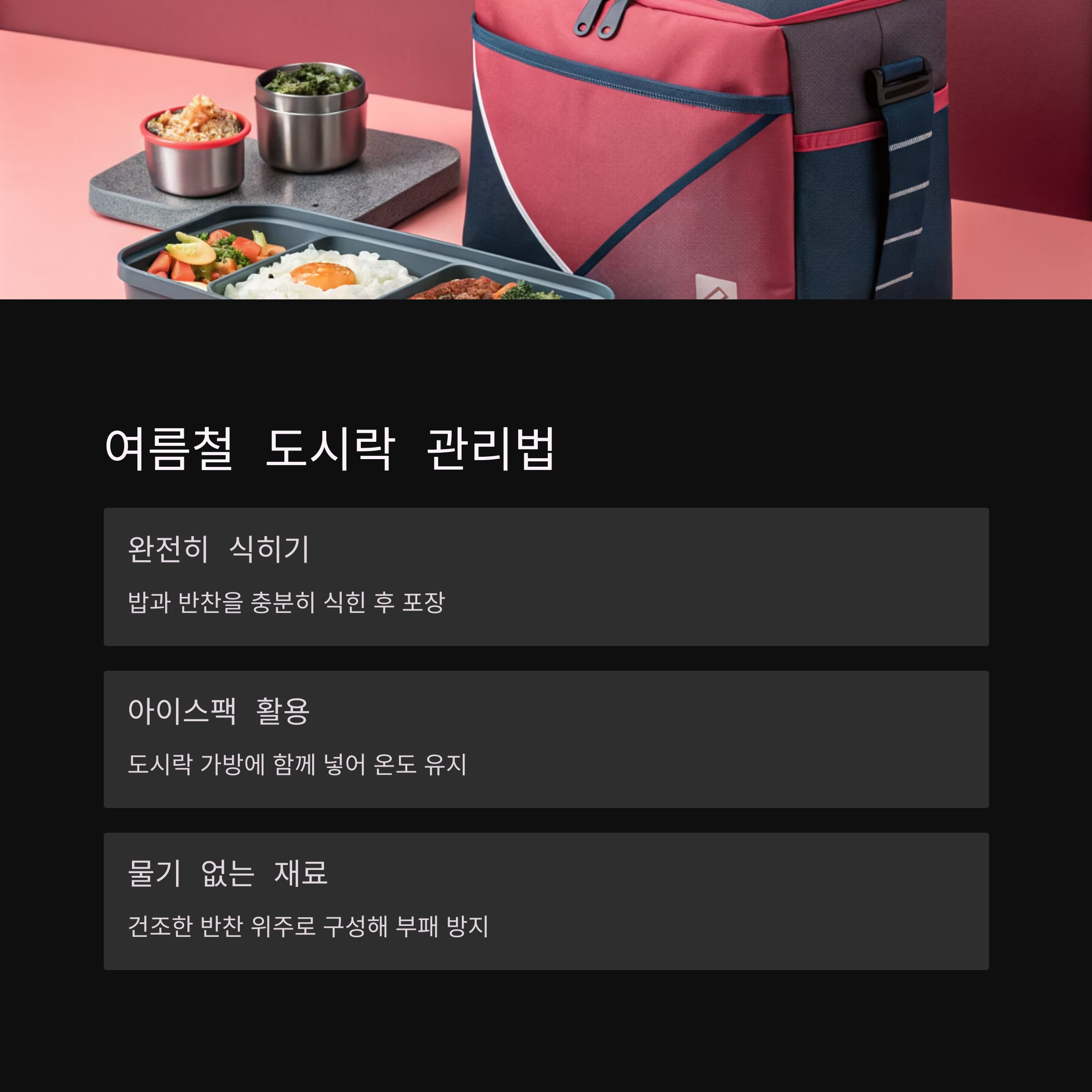 | 당근채볶음 | 살짝 볶아 식혀 보관 | 색감과 아삭함 모두 확보 |