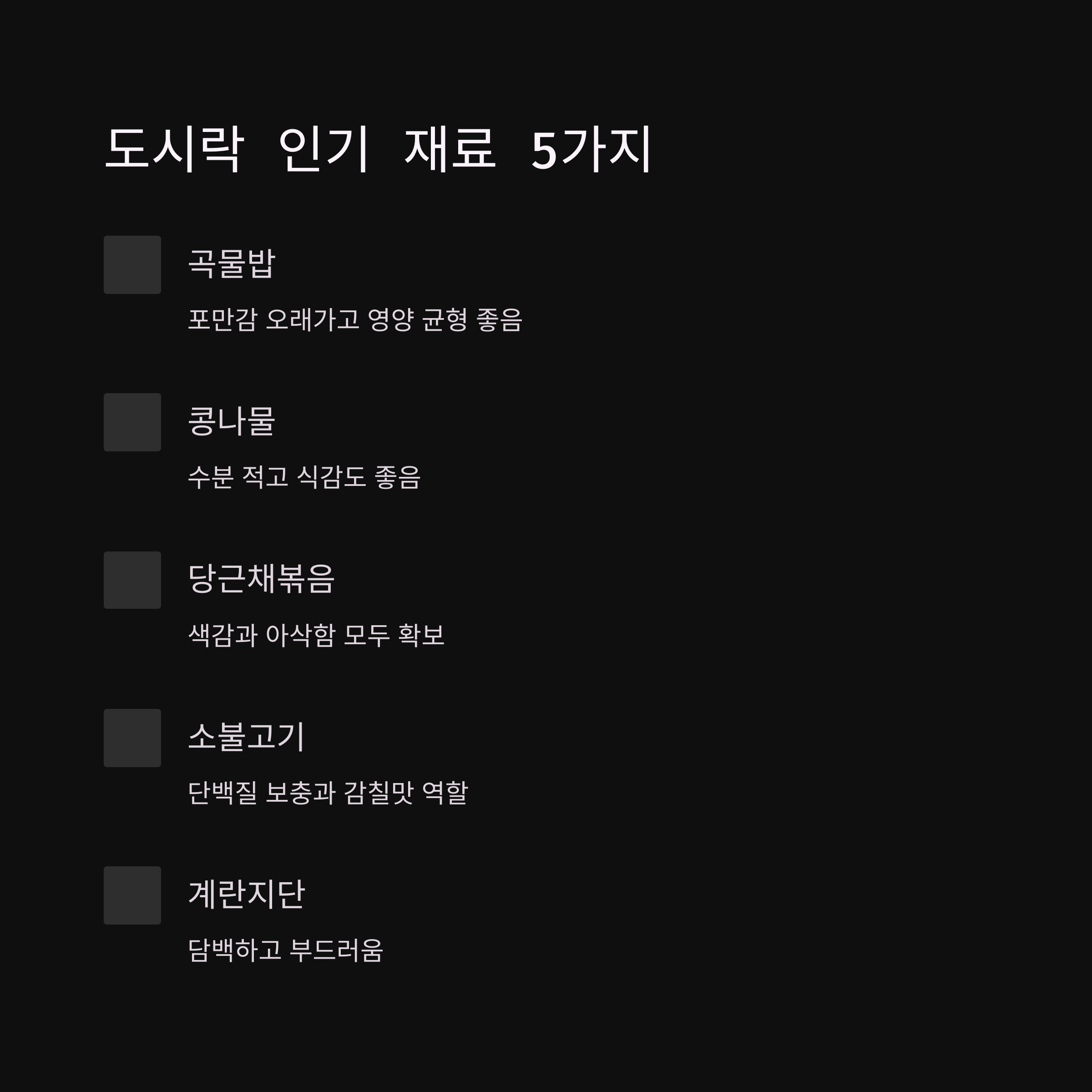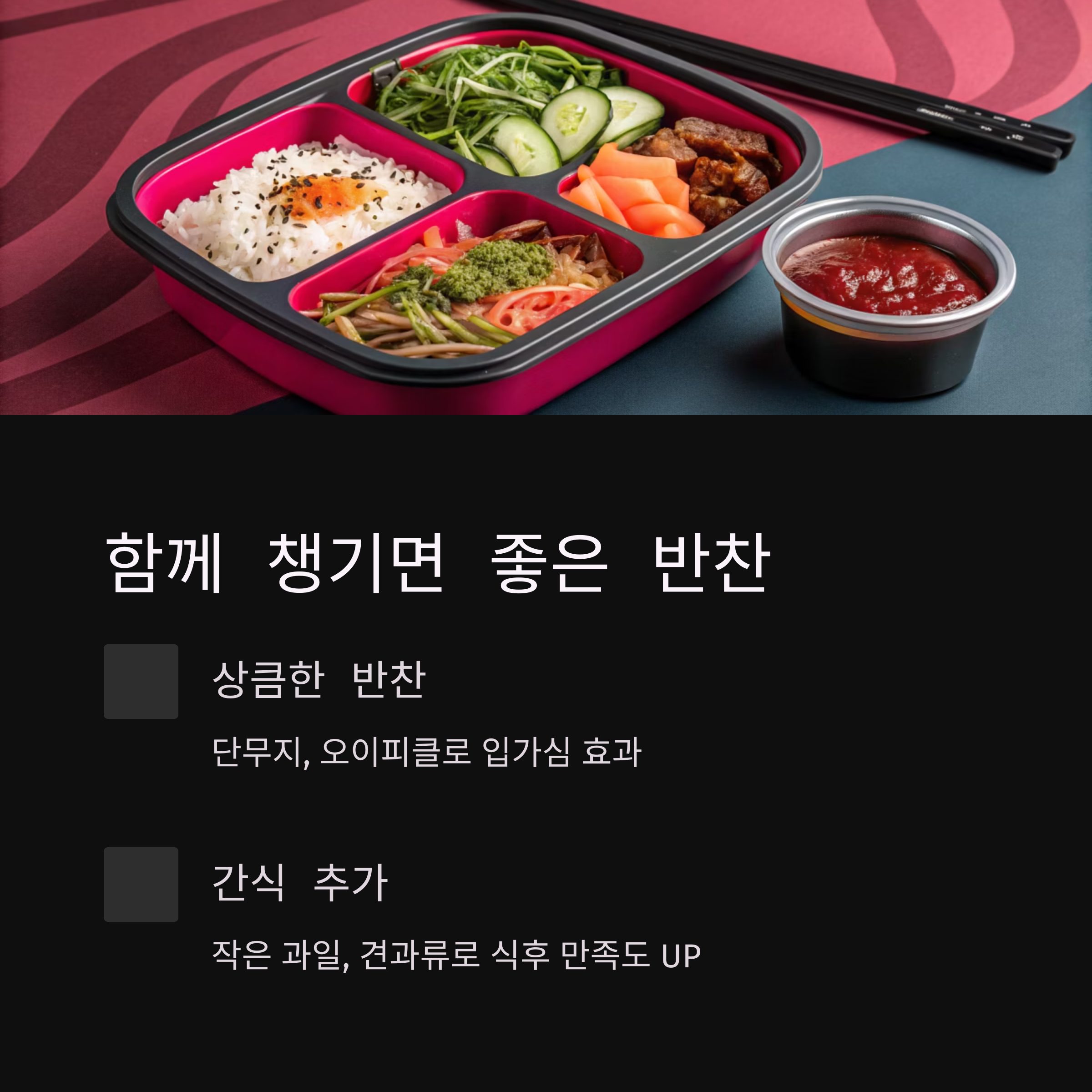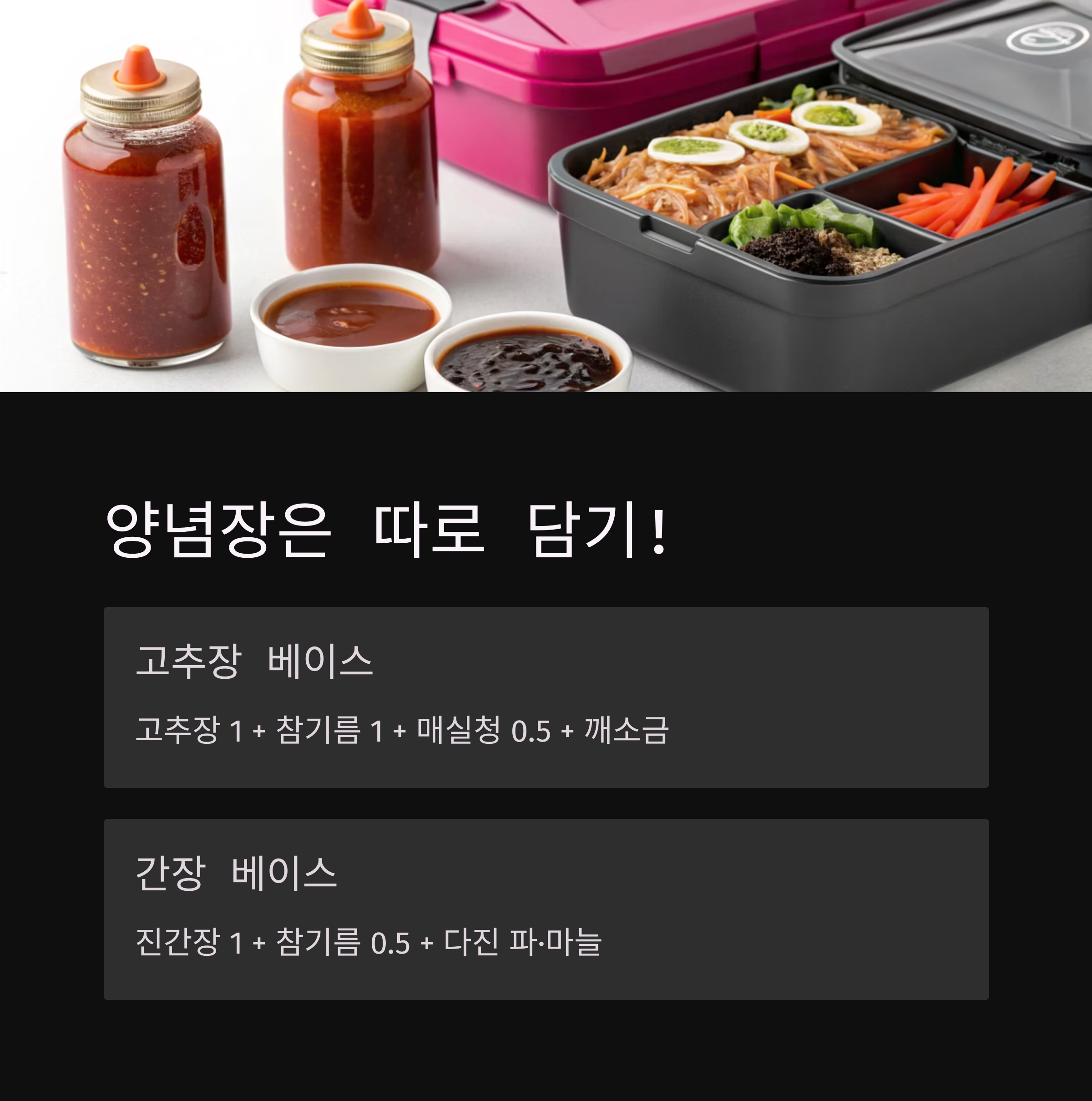 | 소불고기 | 양념해 볶고 분리 보관 | 단백질 보충과 감칠맛 역할 |