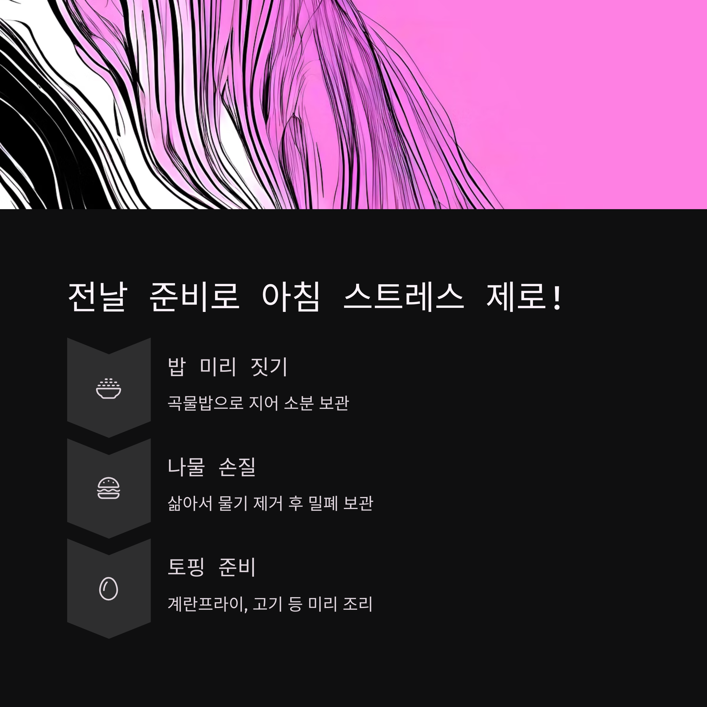 전날 저녁에 밥, 나물, 고명까지 모두 준비해 두는 것이 핵심입니다.