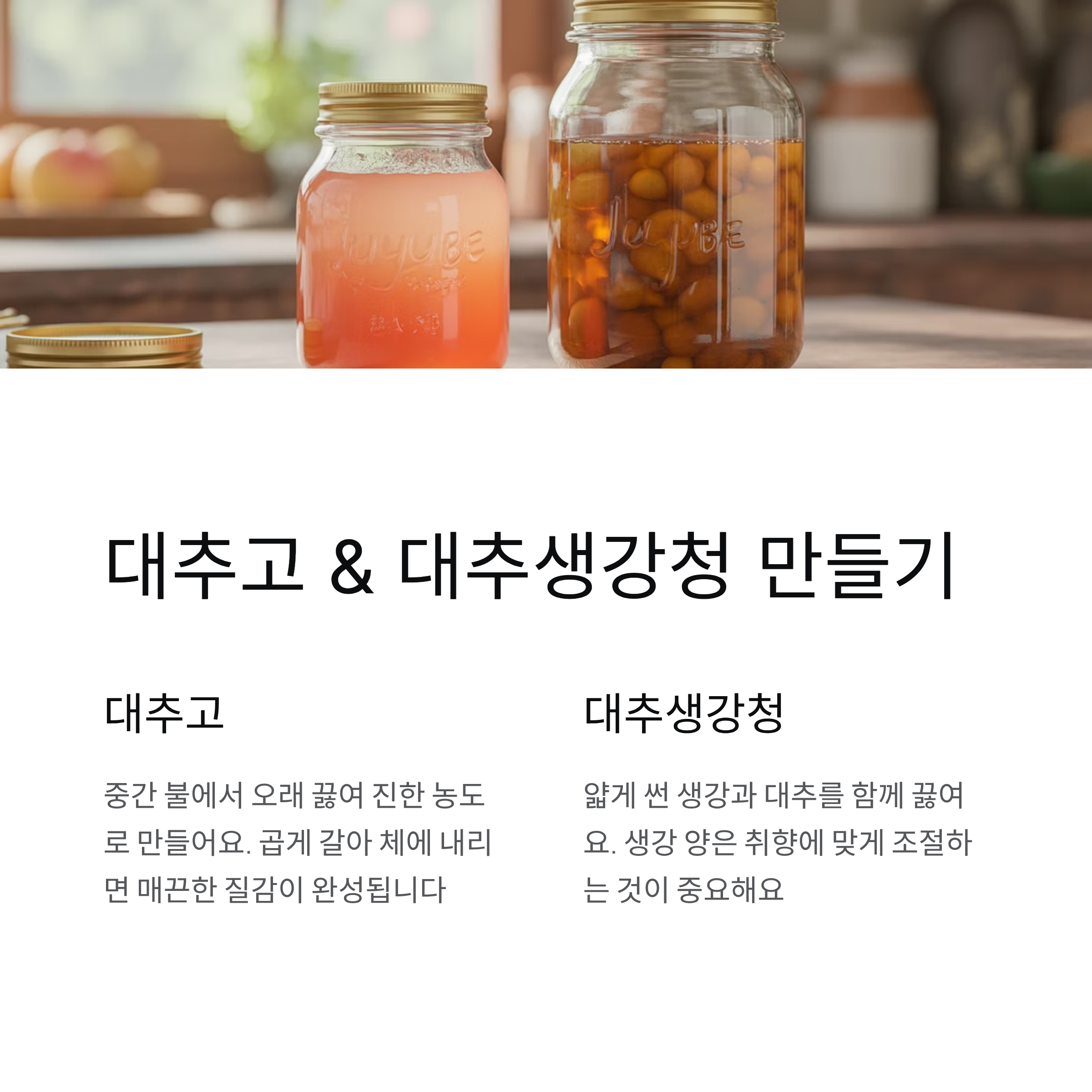재료 손질부터 끓이는 과정까지 천천히 따라가다 보면 생각보다 어렵지 않게 완성하실 수 있을 거예요. 오래 끓일수록 깊은 풍미가 살아나니 서두르지 말고 은근하게 시간을 들여 보세요. 만들어 둔 대추고와 대추생강청은 다양하게 활용할 수 있어 언제 꺼내 쓰든 활용도가 높습니다. 편안하게 한 잔 따라 즐기며 여유도 함께 가져보세요.