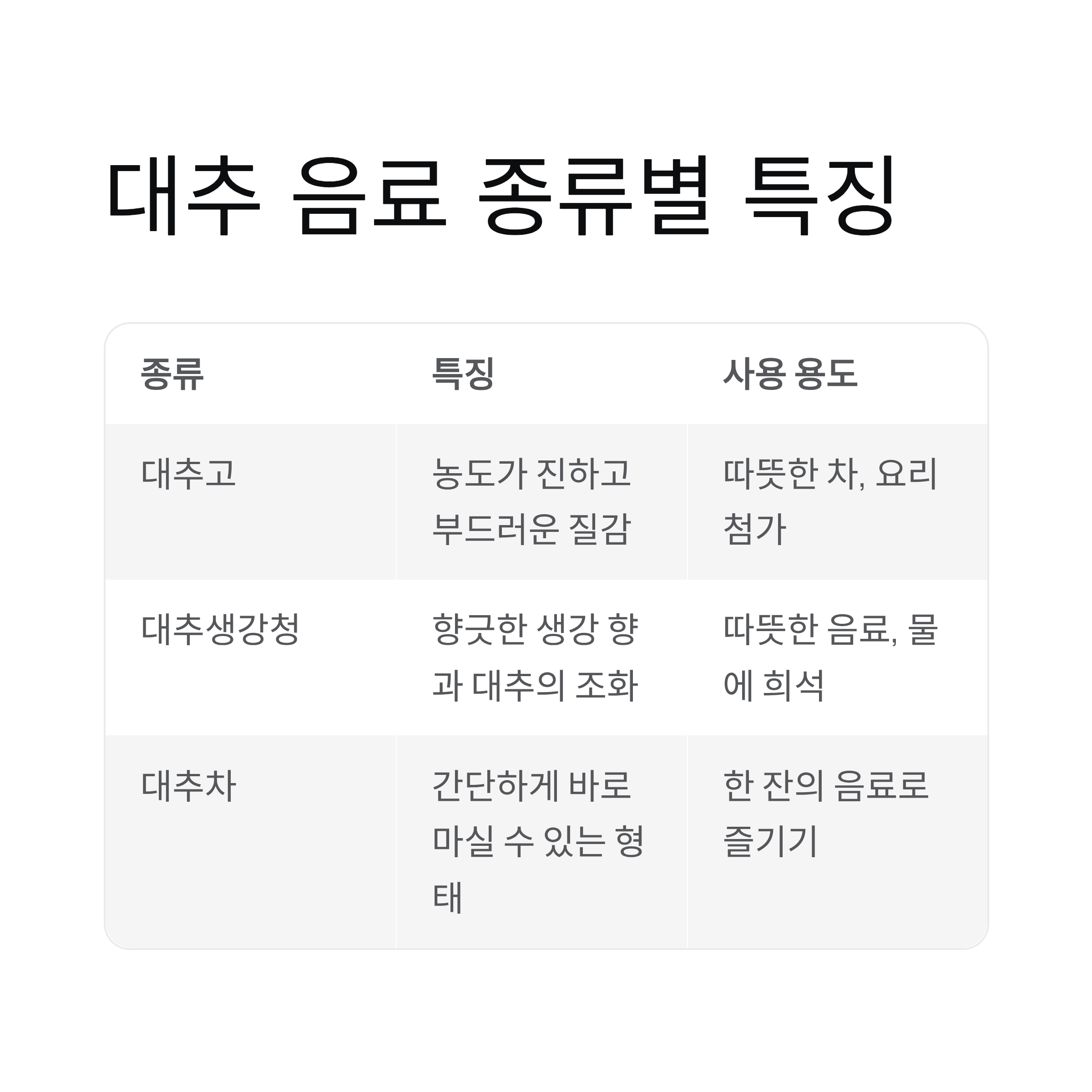 아래 표에 대추 음료 준비 과정과 특징을 간단하게 정리해 두었어요. 필요할 때 가볍게 참고해 보세요.