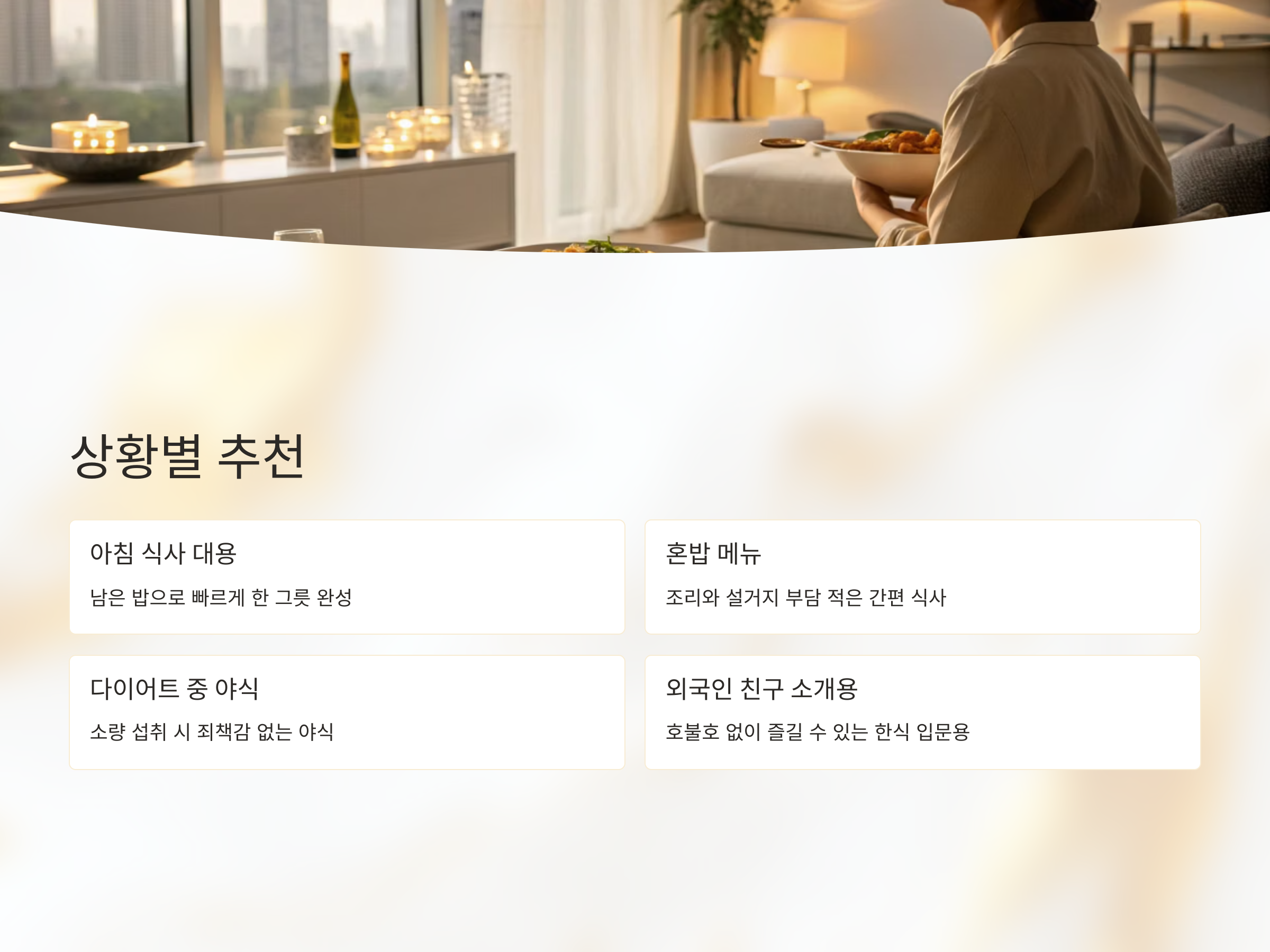 - 혼밥 메뉴: 조리와 설거지 부담 적은 간편 식사