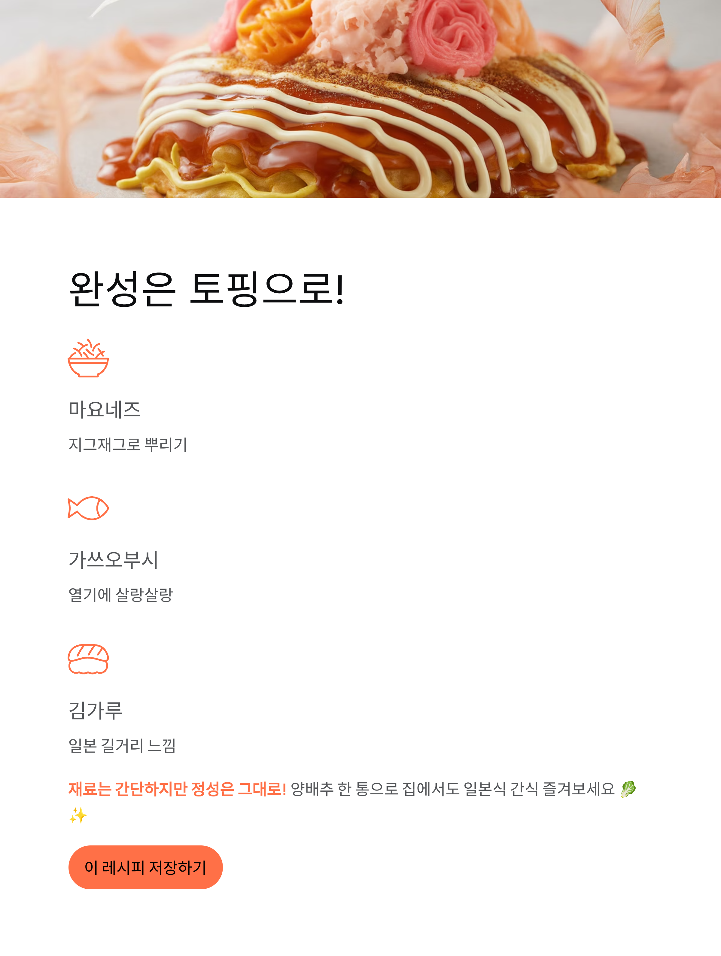 마지막 단계는 토핑이에요. 마요네즈를 지그재그로 뿌리고, 가쓰오부시와 김가루를 살살 올려주세요. 열기에 살짝 움직이는 가쓰오부시를 보면 진짜 일본 길거리 느낌이 나죠. 취향에 따라 옥수수, 치즈, 청양고추를 추가해도 좋아요.