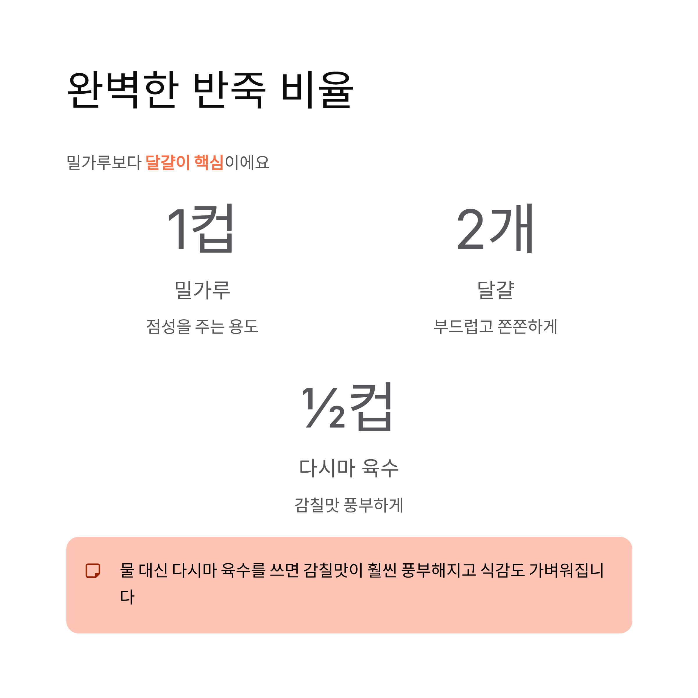 비율의 기본은 밀가루 1컵에 달걀 2개, 물 ½컵이에요. 물 대신 다시마 육수를 쓰면 감칠맛이 훨씬 풍부해지고, 식감도 한층 가벼워집니다.
