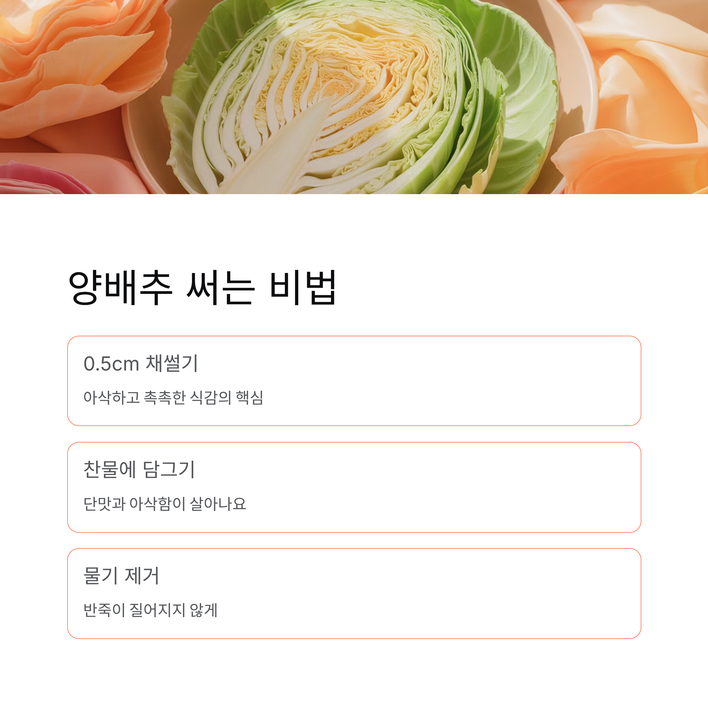 양배추는 오코노미야키의 식감을 결정짓는 가장 중요한 재료입니다. 너무 굵게 썰면 덜 익고, 너무 잘게 썰면 씹는 재미가 없어요. 0.5cm 정도의 가는 채로 써는 게 가장 이상적이에요. 썬 후 찬물에 살짝 담갔다가 물기를 빼면 더 아삭하고 단맛이 살아납니다.