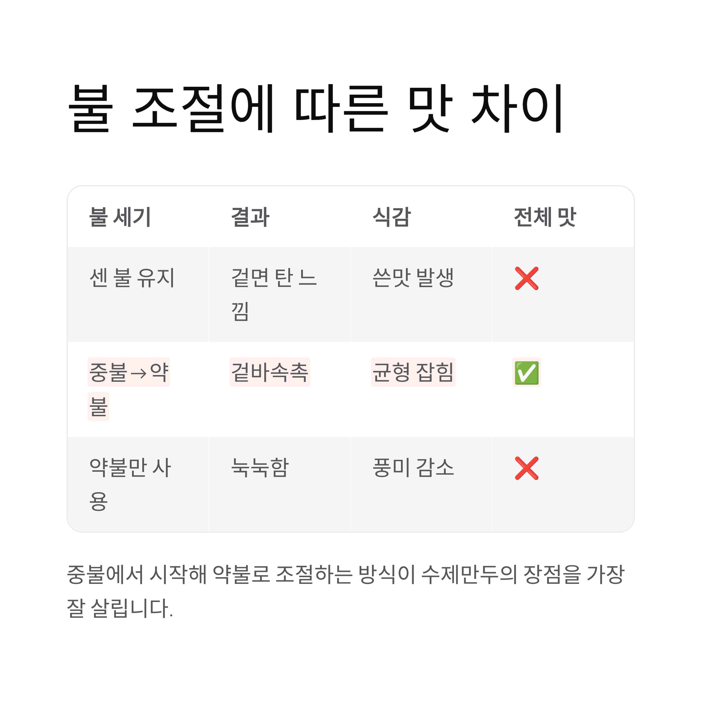 아래 표는 불 조절에 따라 나타나는 수제만두의 맛 차이를 정리한 내용입니다.