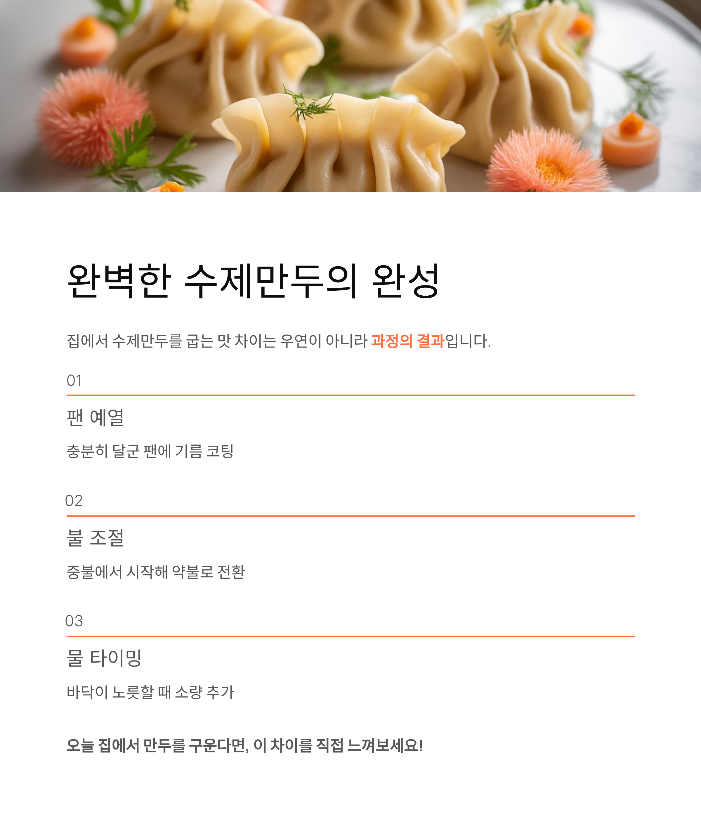 집에서 수제만두를 굽는 맛 차이는 우연이 아니라 과정의 결과입니다. 팬 예열, 불 조절, 물을 넣는 타이밍이라는 세 가지 요소가 서로 연결되며 최종 식감을 완성합니다. 이 과정을 이해하면 수제만두는 단순한 분식이 아니라 완성도 높은 한 끼가 됩니다. 오늘 집에서 만두를 굽는다면, 조금만 더 신경 써서 그 차이를 직접 느껴보셔도 좋겠습니다.