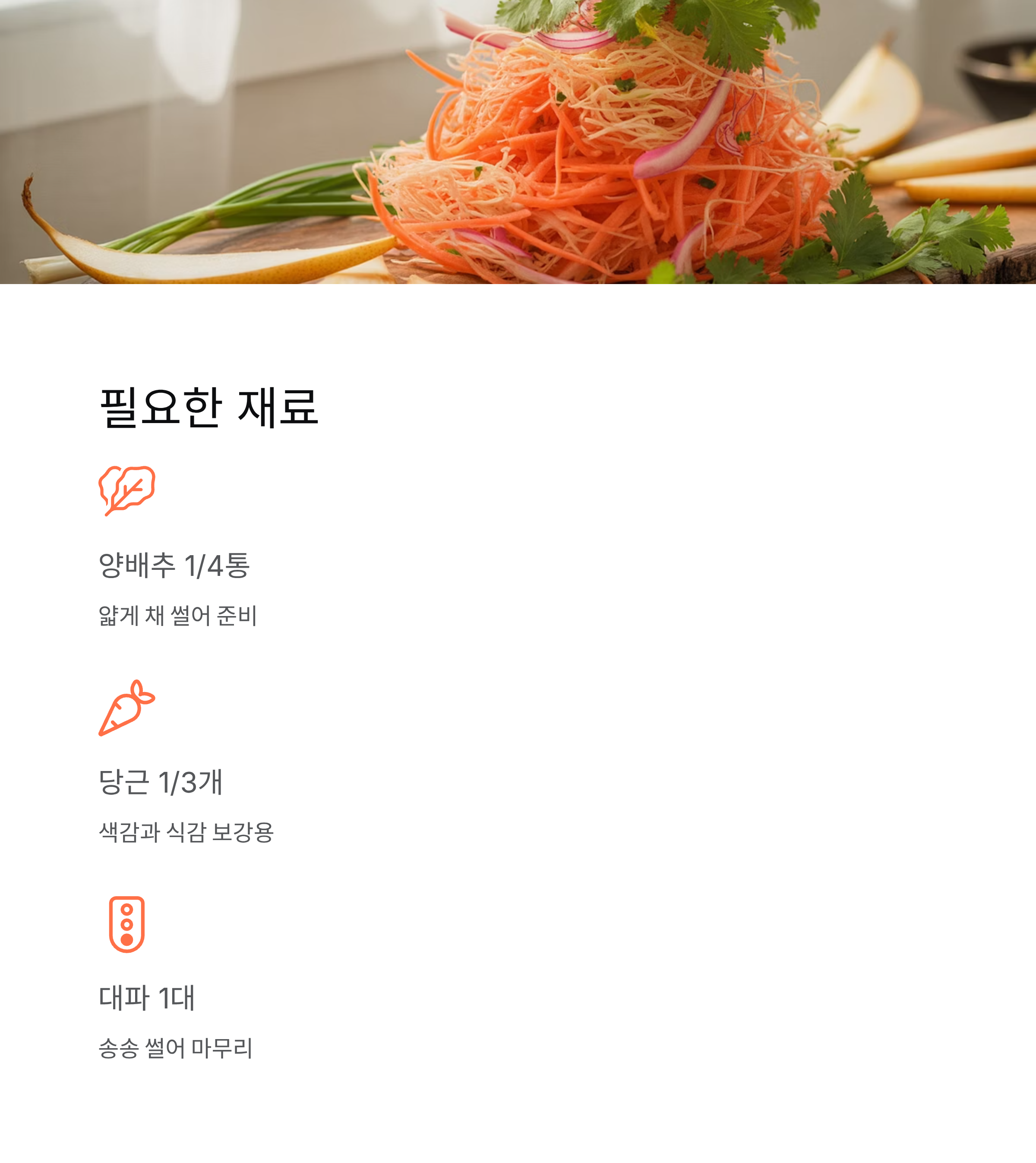 | 양배추 | 1/4통 | 얇게 채 썰기 |