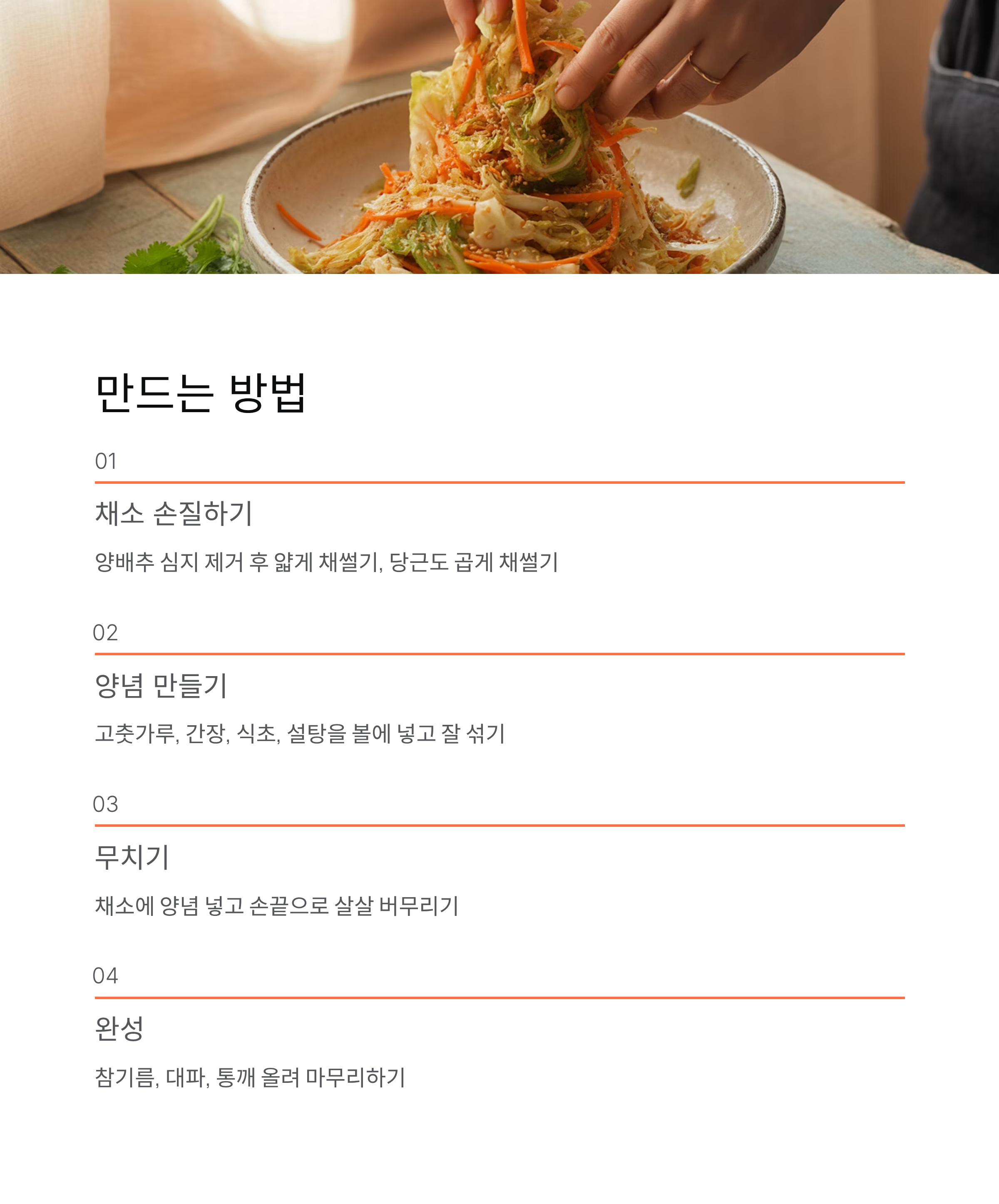 양배추 겉절이는 별다른 숙성 과정 없이 바로 무쳐서 먹을 수 있어 간편합니다.