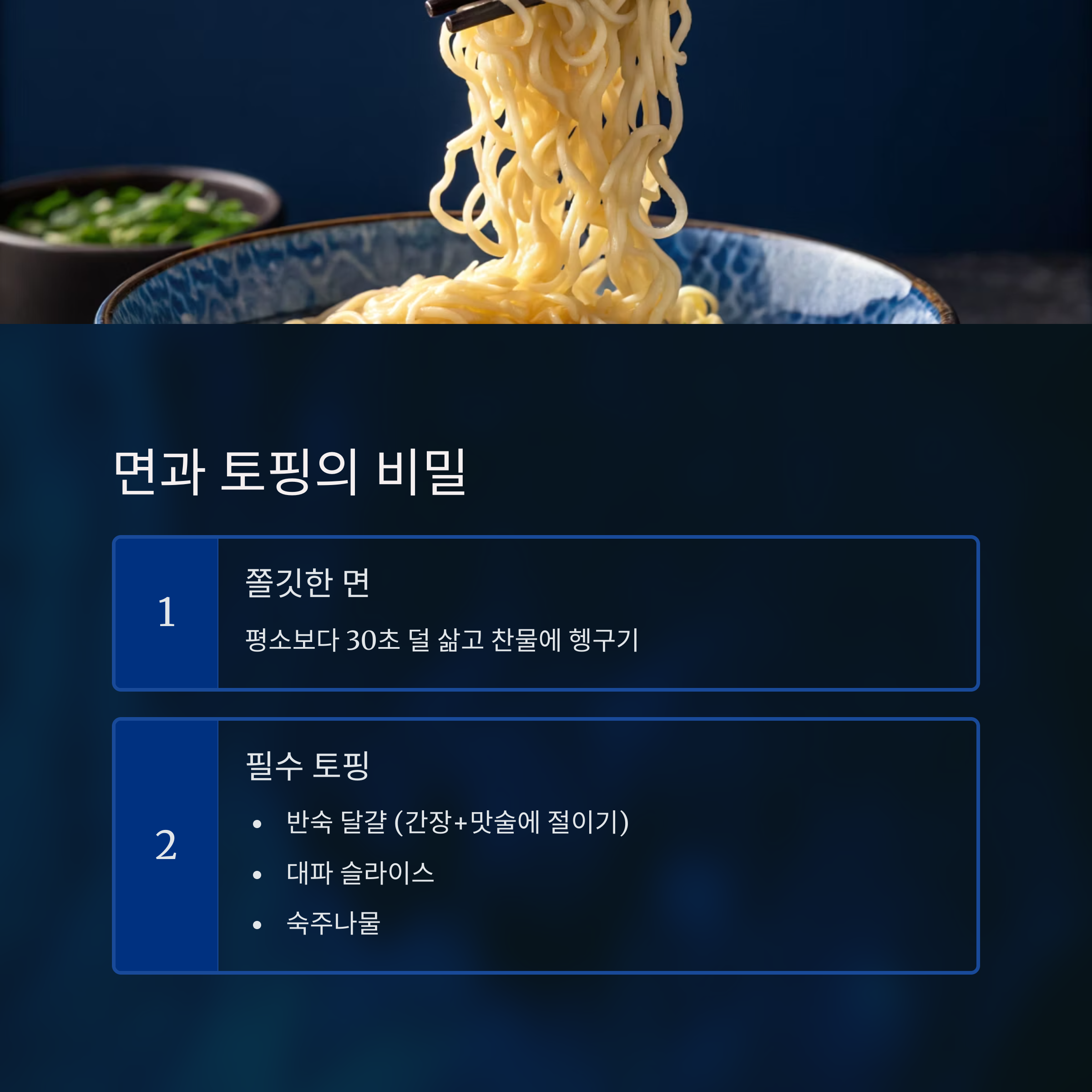 면을 평소보다 30초 덜 익혀서 약간의 탄력을 유지해야