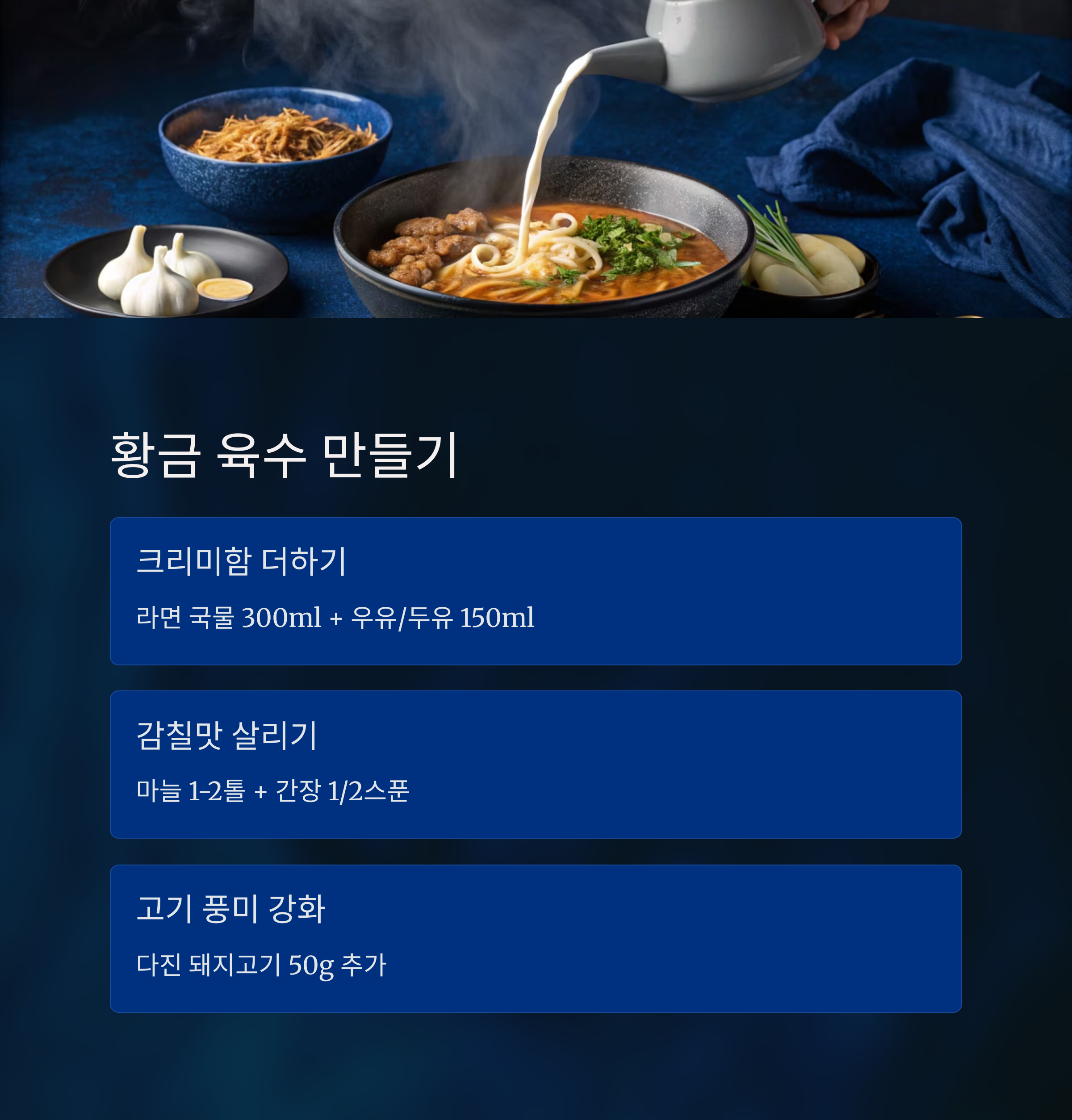 기본은 돼지 뼈나 고기 풍미가 있는 '진한 국물형' 라면을 고르는 것이 중요합니다.