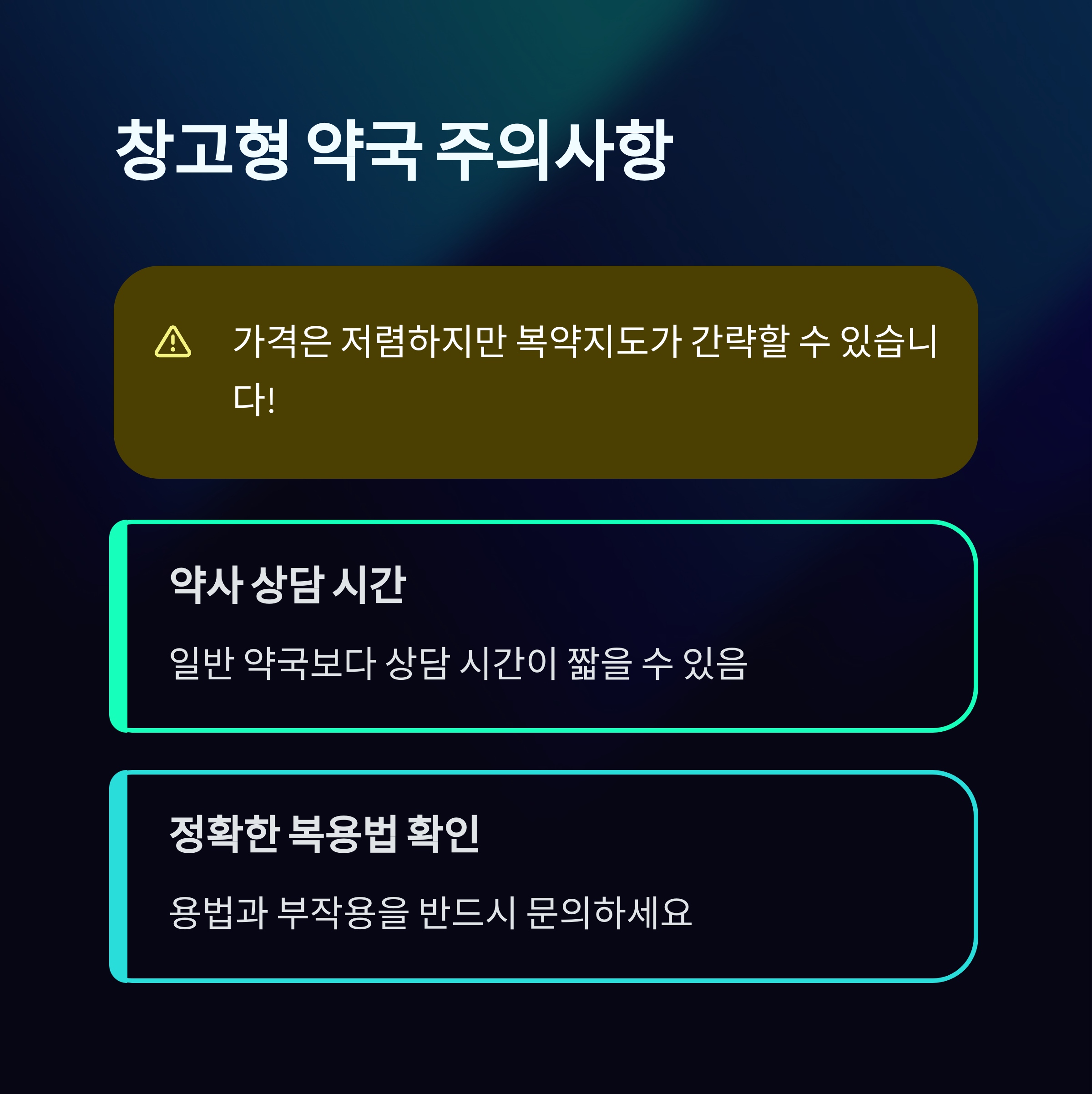 창고형 약국은 저렴한 가격이 장점이지만, 약사의 상담이나 복약 지도가 간략하게 이루어질 수 있습니다. 약의 용법이나 부작용 등을 충분히 설명받고 복용하시는 것이 중요합니다.
