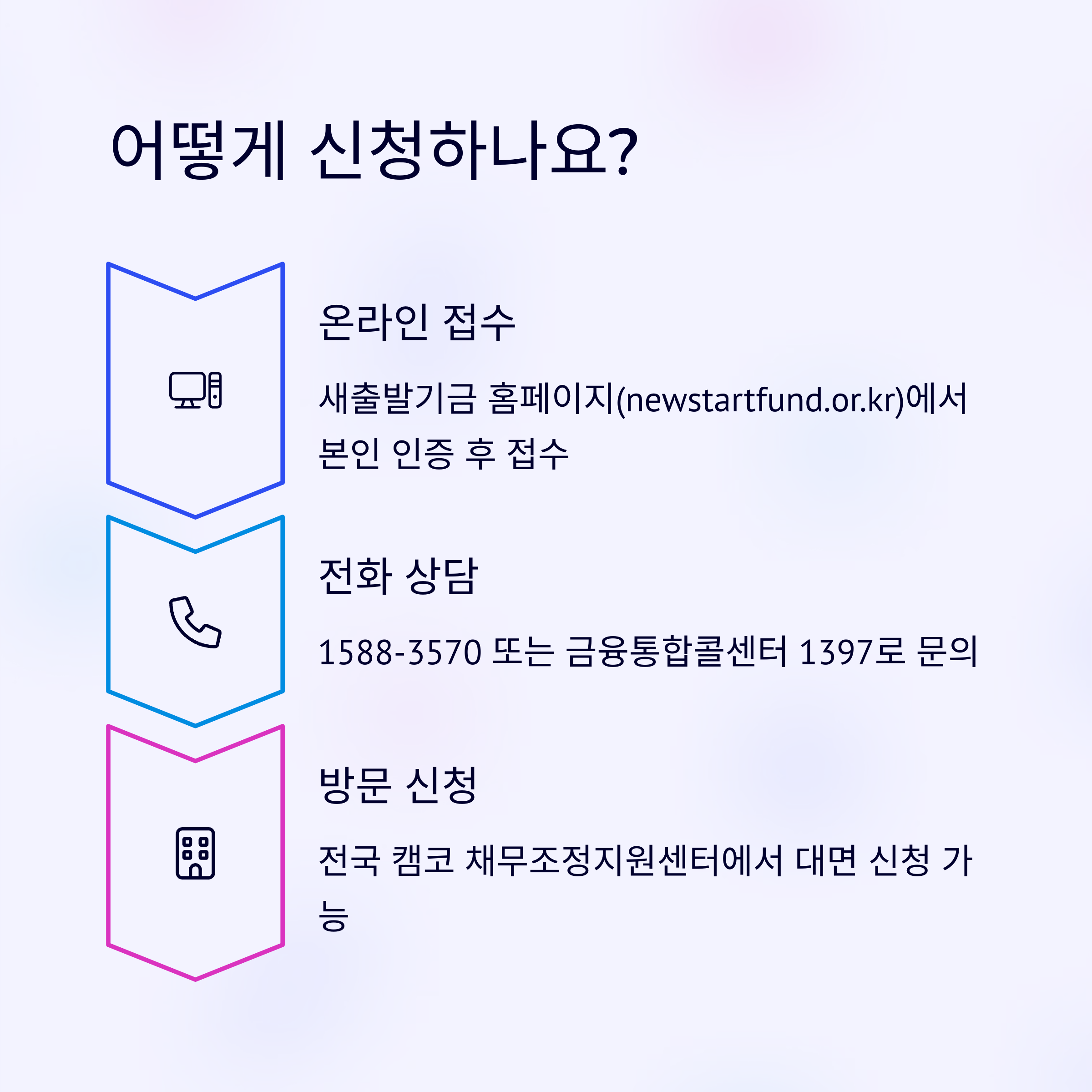 신청은 새출발기금 홈페이지에서 본인 인증 후 접수가 가능하며,