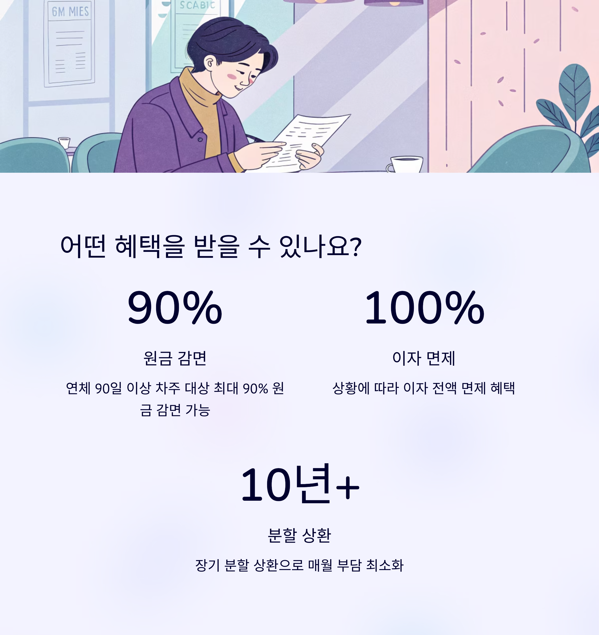 | 연체 90일 이상 | 원금 최대 90% 감면, 이자 전액 면제 | 부실채권 중심 구조조정 |