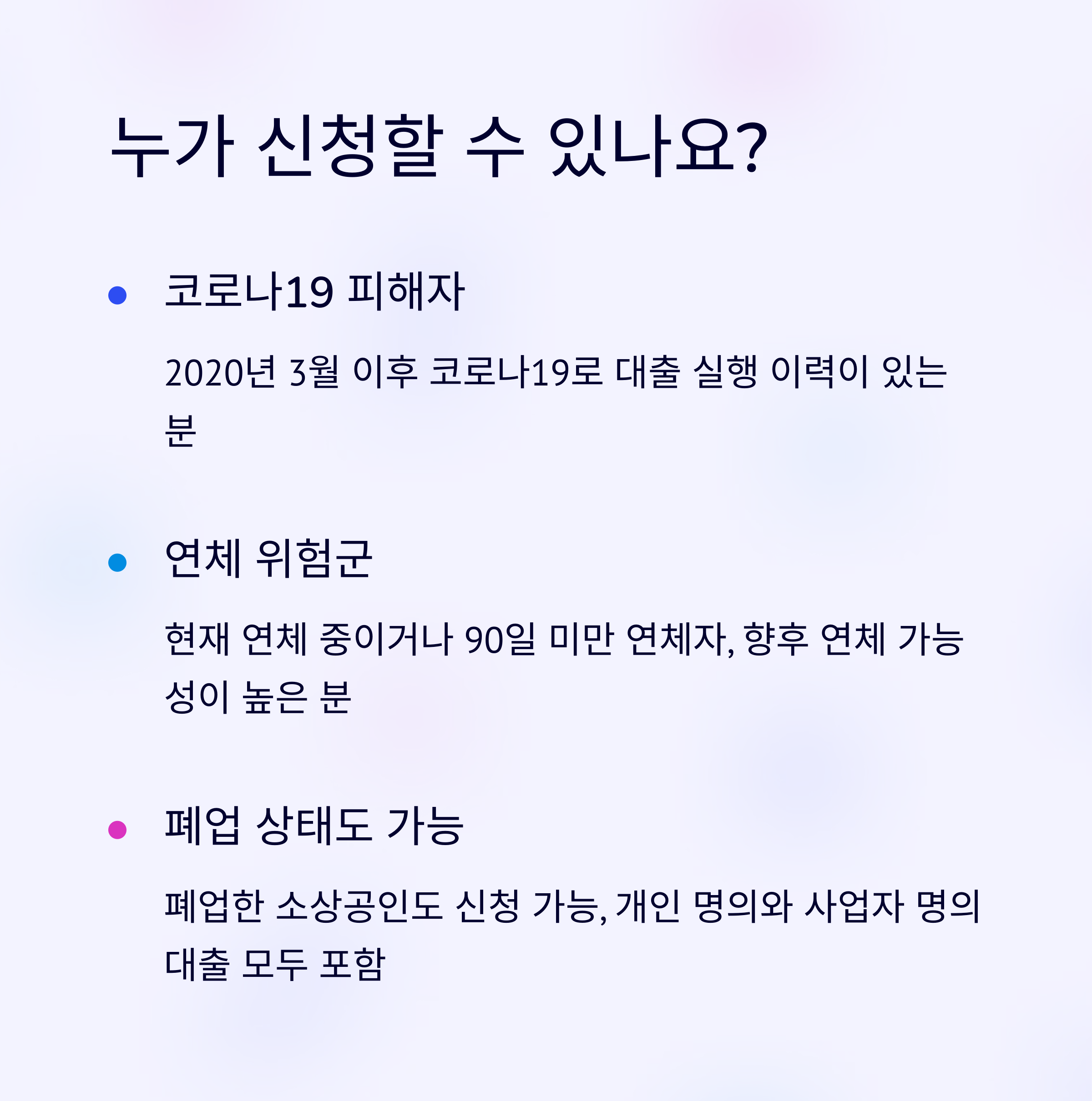 폐업 상태여도 신청할 수 있으며, 개인 명의와 사업자 명의 대출 모두 포함됩니다.