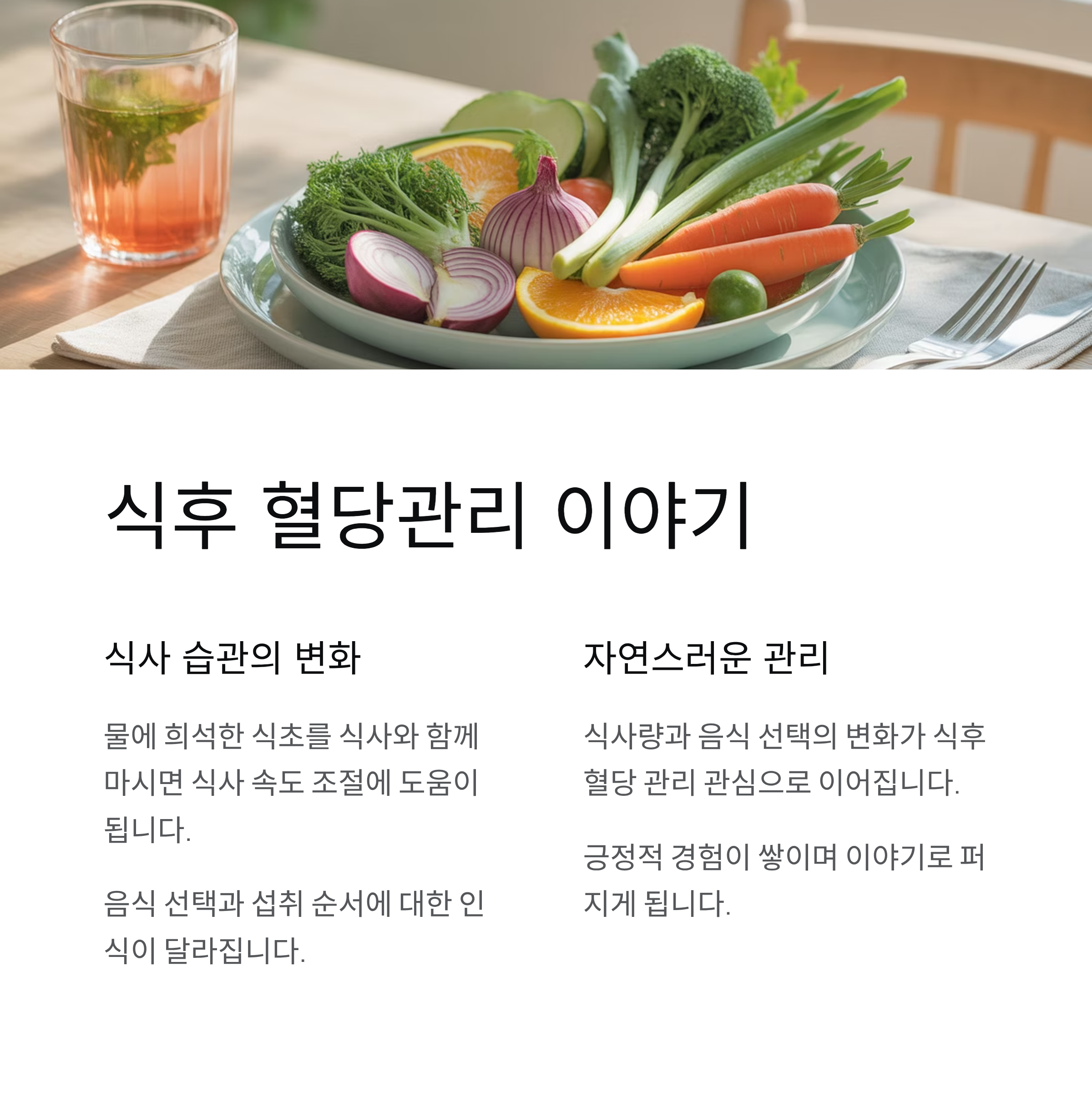 식후 혈당은 음식 선택과 식사 속도, 섭취 순서에 따라 달라질 수 있습니다. 이 과정에서 물에 희석한 식초를 식사와 함께 마시는 습관이 식사 속도를 조절하는 데 도움을 줄 수 있다는 인식이 생겼습니다. 결과적으로 식사량과 음식 선택에 대한 인식이 달라지고, 이런 변화가 식후 혈당 관리에 관심을 가진 사람들에게 긍정적인 경험으로 받아들여지며 이야기로 퍼지게 됩니다.