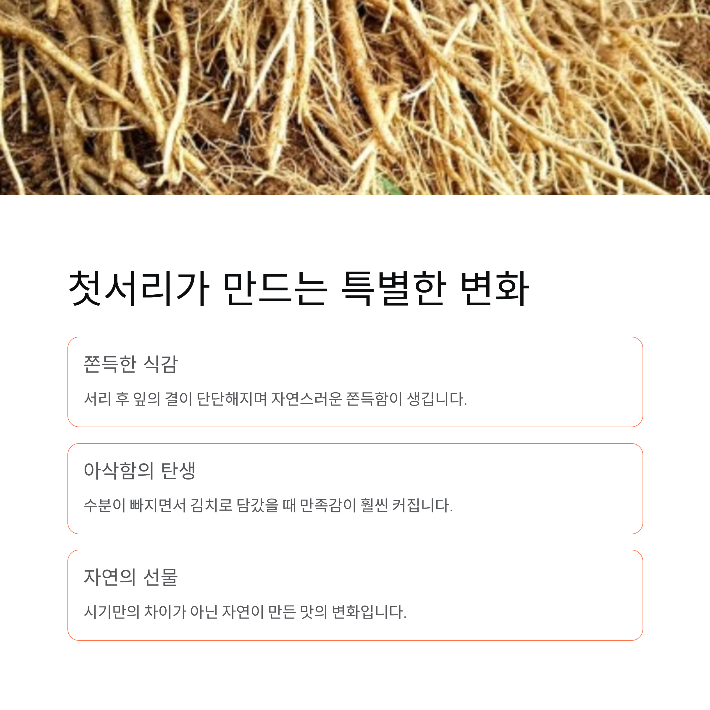 | 첫서리 산고들빼기 | 아삭함이 살아있는 식감 | 씹는 재미가 뛰어남 |