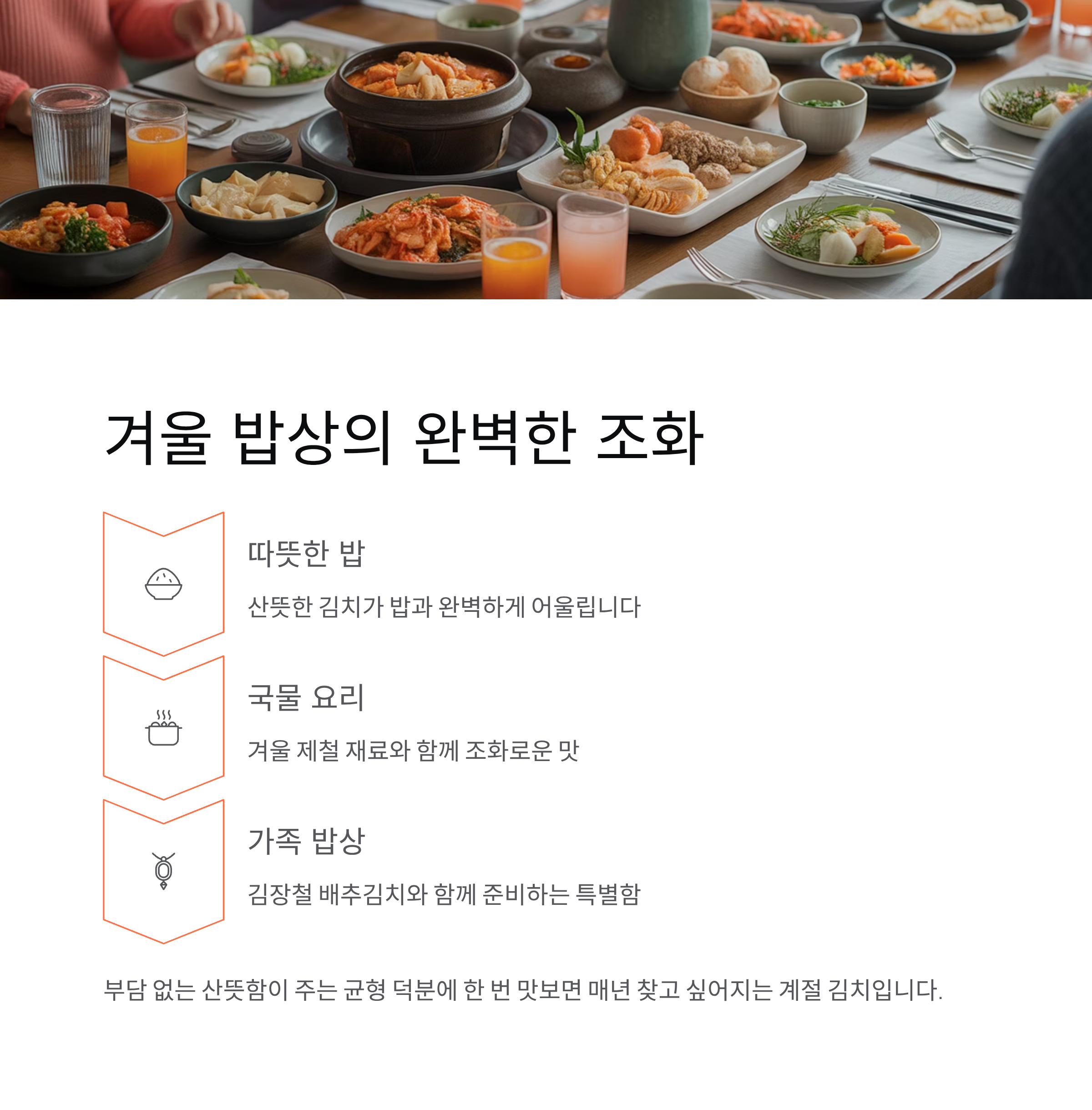 | 겨울 김치 활용 | 다양한 반찬과 조화 | 식탁 구성의 폭이 넓어짐 |