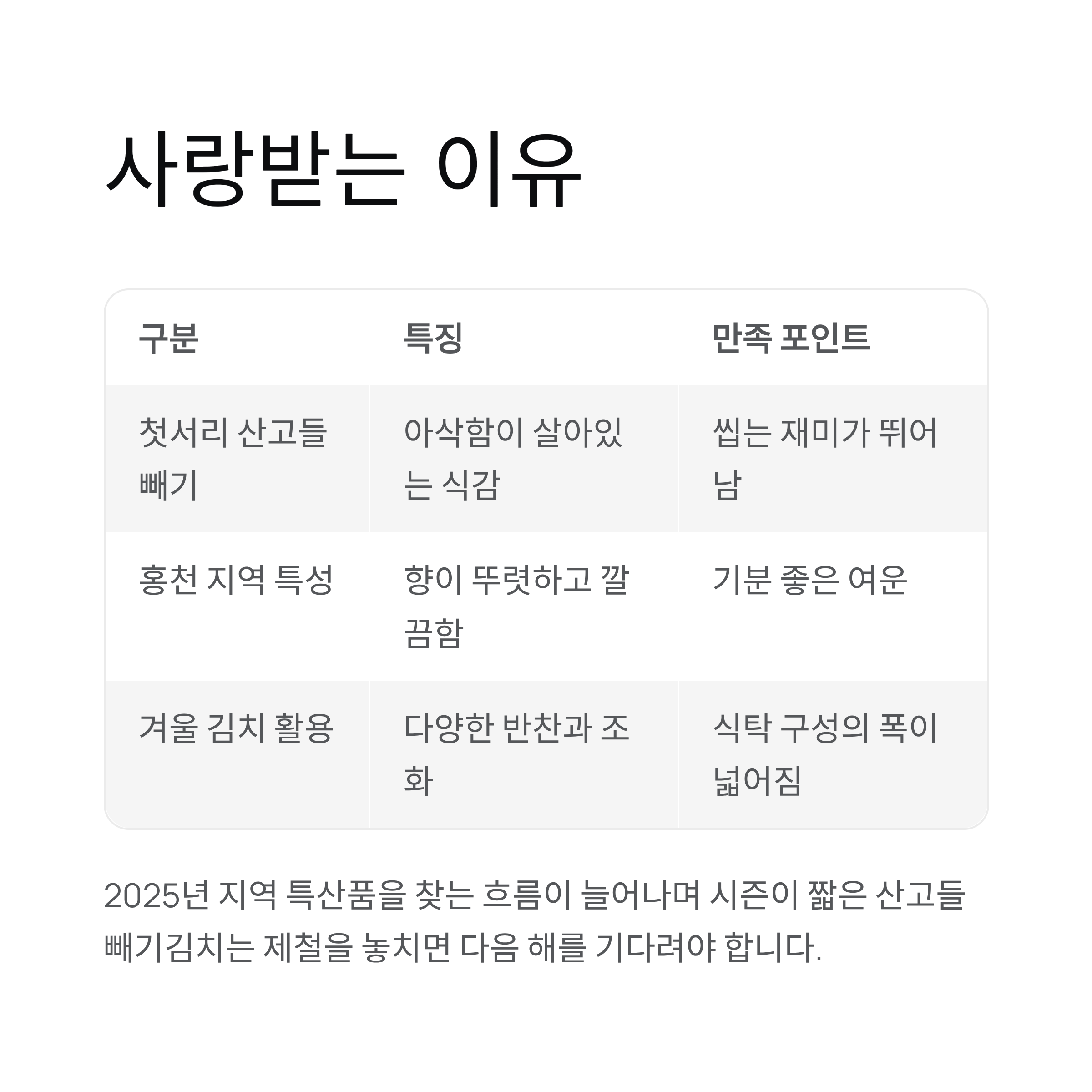 홍천 산고들빼기김치가 사랑받는 이유를 표로 정리