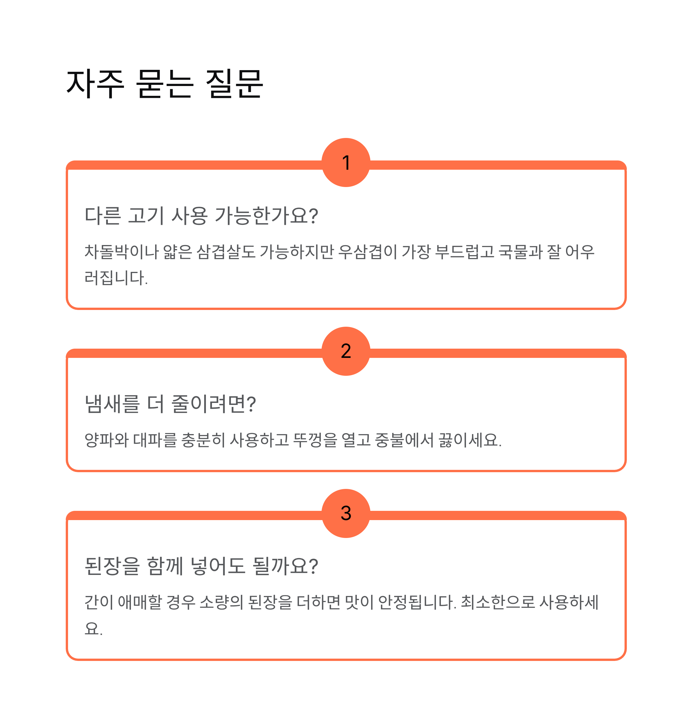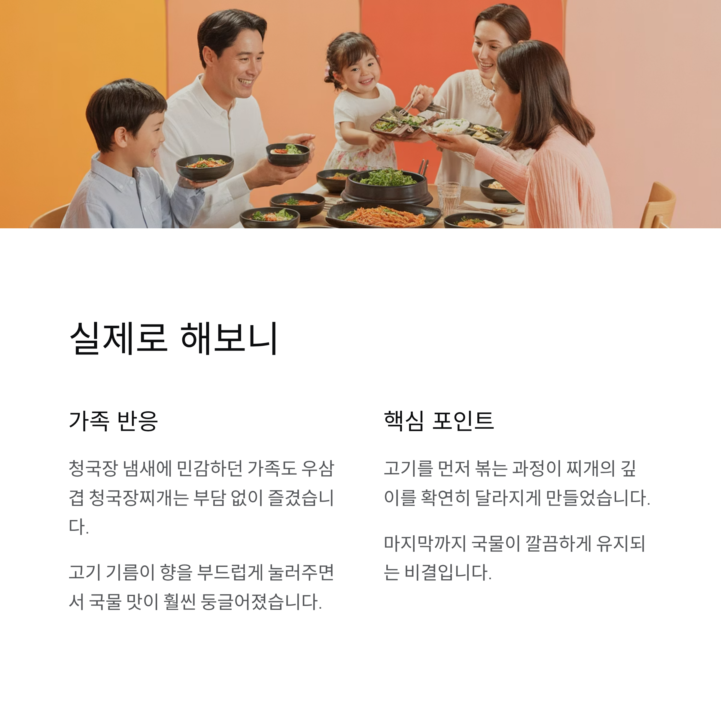 집에서 청국장찌개를 잘 먹지 않던 가족을 위해 우삼겹을 넣어 끓여본 적이 있습니다. 평소 청국장 냄새에 민감하던 사람도 우삼겹 청국장찌개는 부담 없이 먹을 수 있었습니다. 고기에서 나온 기름이 향을 부드럽게 눌러주면서 국물 맛이 훨씬 둥글어졌다는 반응이 많았습니다.
