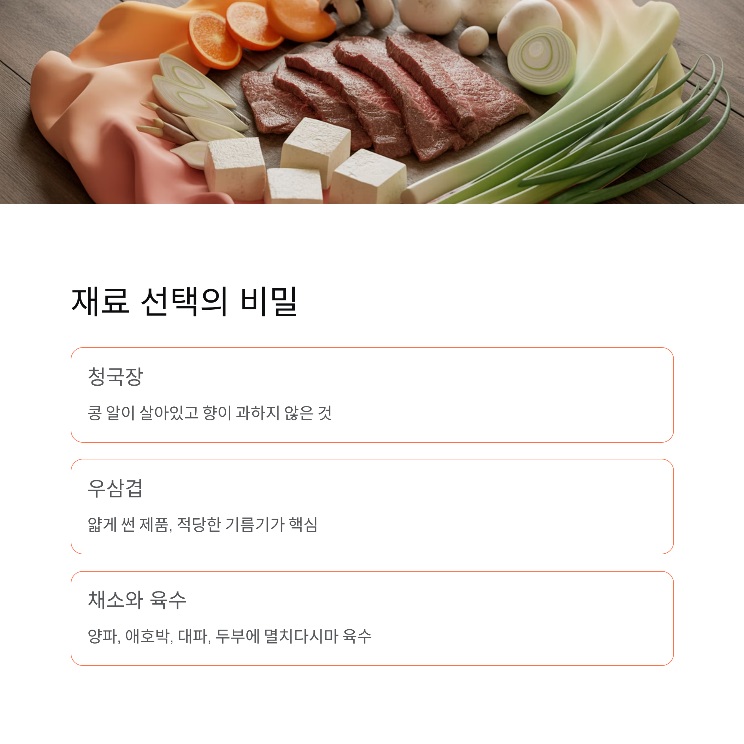 우삼겹 청국장찌개의 핵심은 재료 간의 균형입니다. 청국장은 콩 알이 살아 있으면서도 향이 과하지 않은 것이 좋습니다. 지나치게 강한 청국장은 우삼겹의 고소함을 덮어버릴 수 있어 조화가 깨질 수 있습니다.