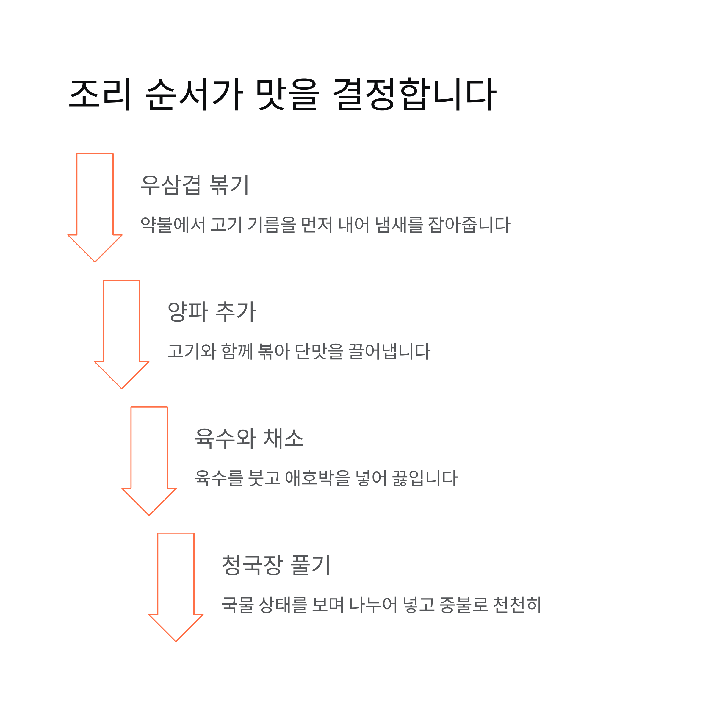 조리 과정에서는 불 조절과 순서가 중요합니다. 먼저 냄비에 우삼겹을 넣고 약불에서 살짝 볶아 고기의 기름을 먼저 내줍니다. 이 과정에서 고기 냄새를 잡아주고 찌개의 기본 맛을 만들어줍니다. 고기가 익기 시작하면 양파를 넣어 함께 볶아 단맛을 끌어냅니다.