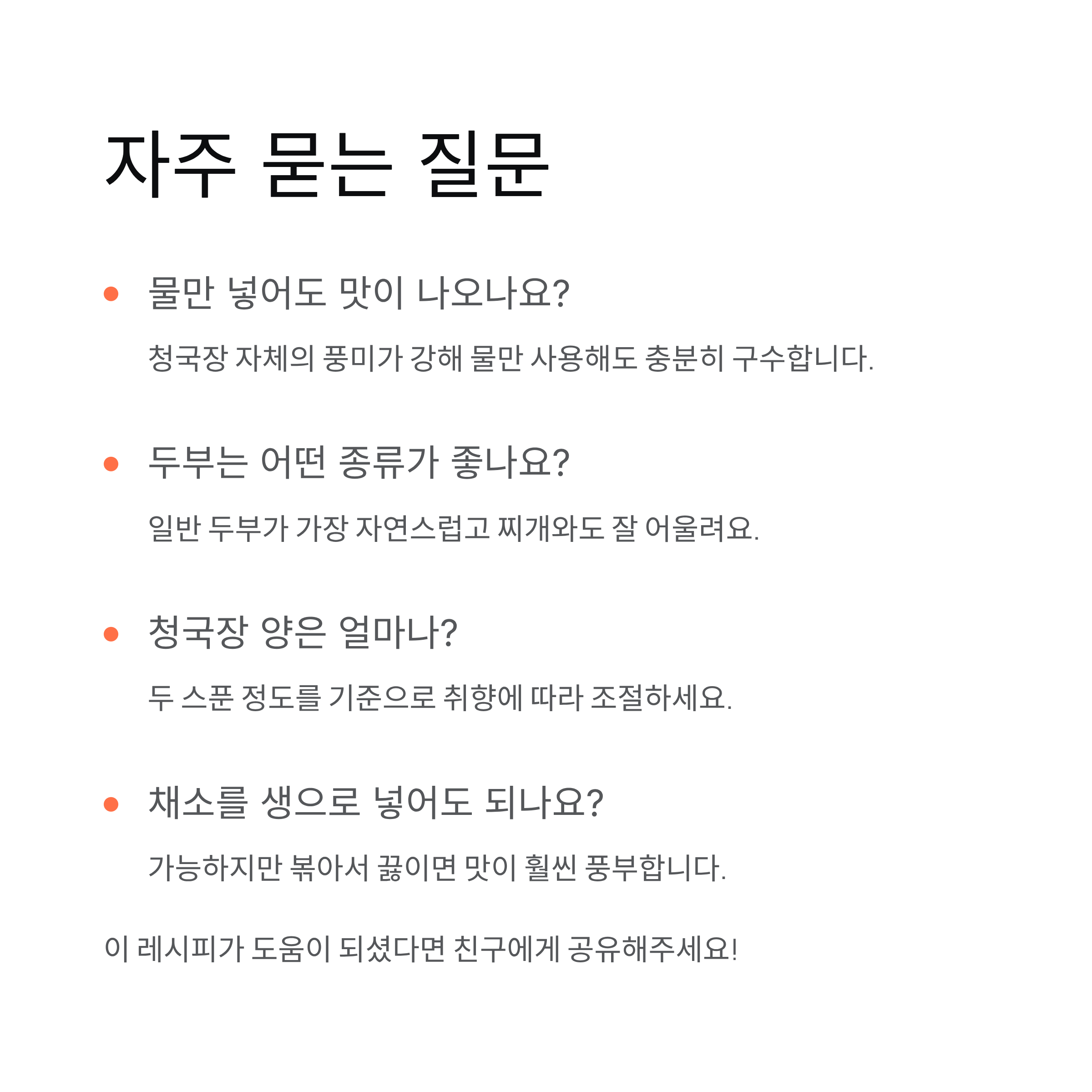 최소한의 재료만으로 깊고 구수한 청국장을 깔끔하게 끓이는 방법은 무엇일까요?