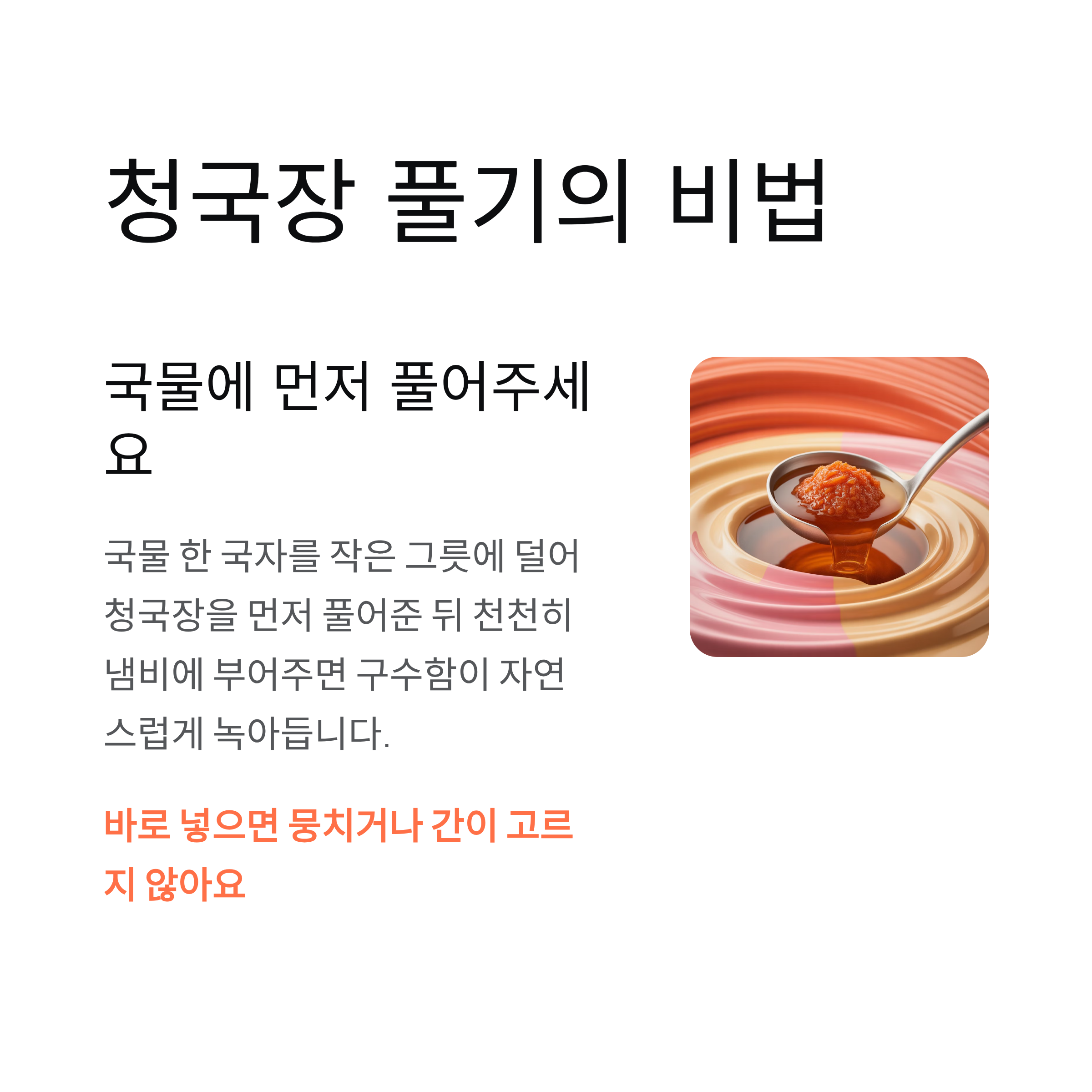 | 청국장 풀기 | 국물에 먼저 풀기 | 균일한 농도 |