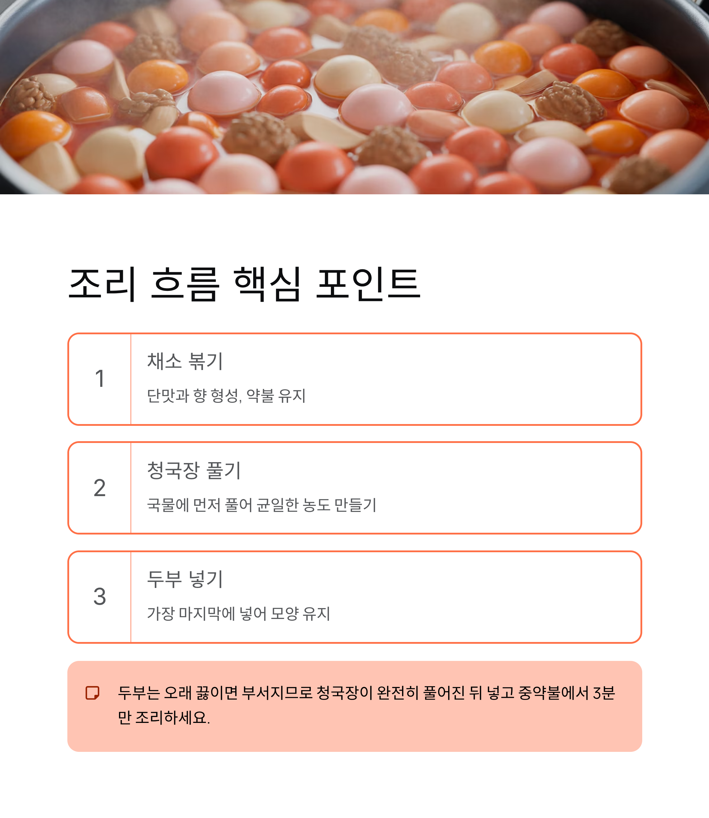 아래 표는 청국장을 끓일 때 참고하면 좋은 핵심 요소를 한눈에 정리한 내용입니다.