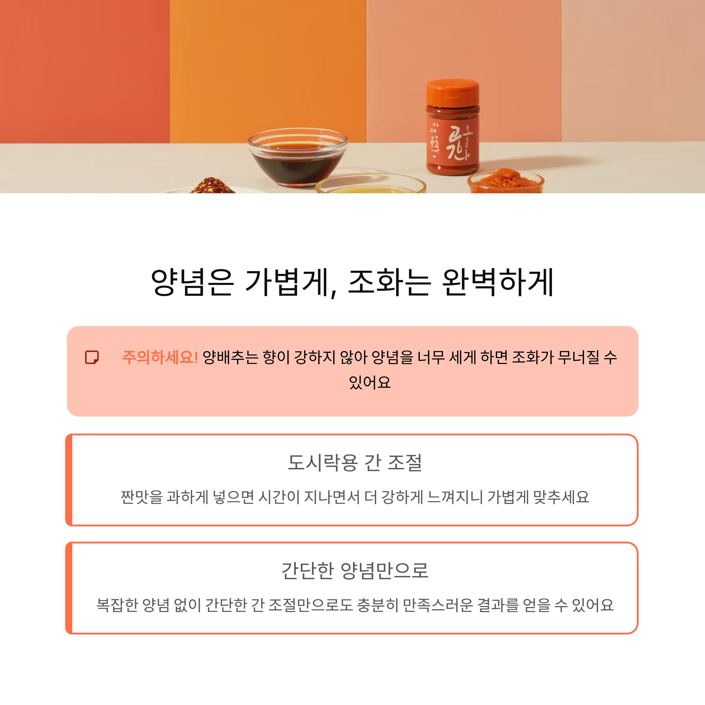 너무 많은 양념은 오히려 식감을 해칠 수 있어요
