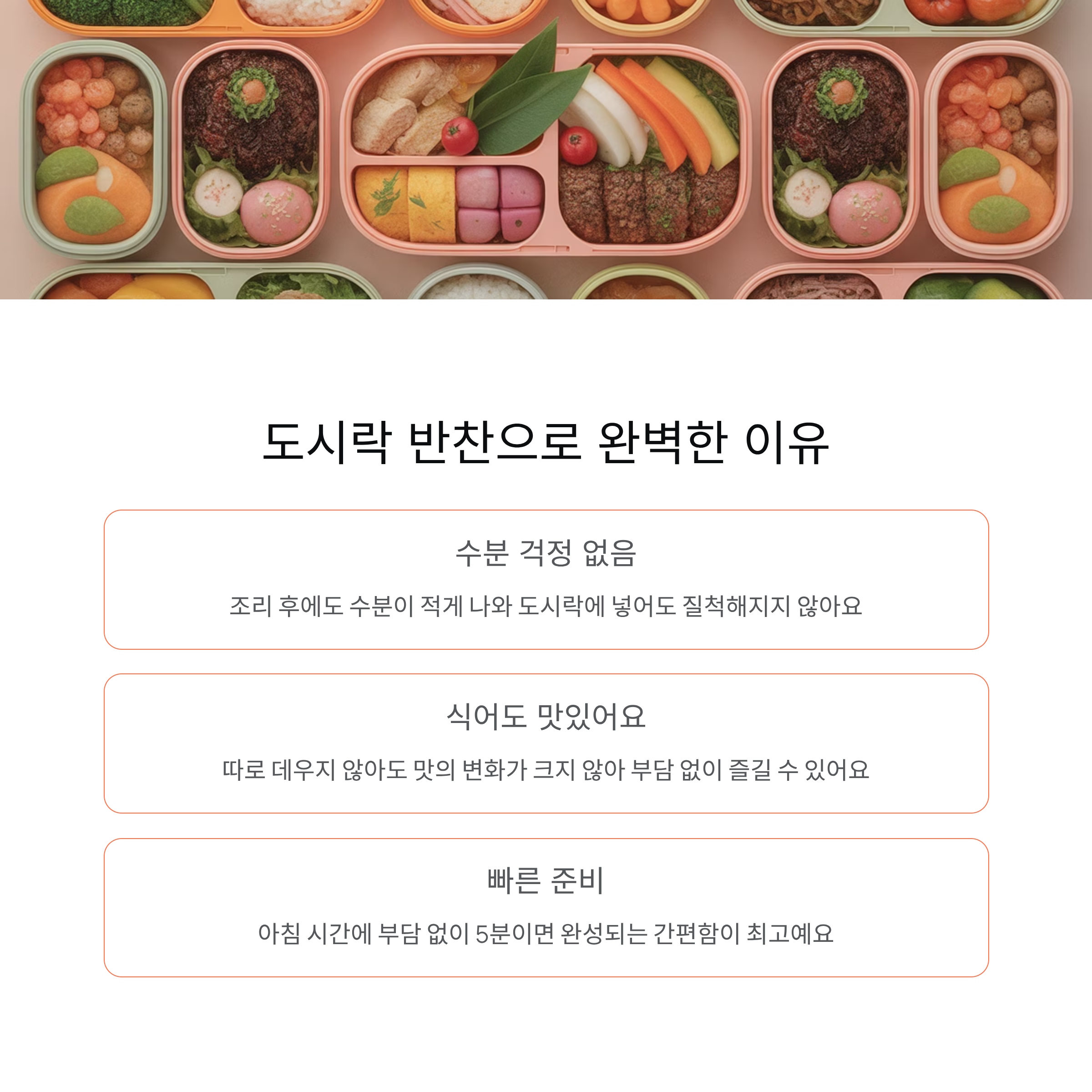 양배추는 조리 후에도 비교적 수분이 적게 나와 도시락에 넣어도 질척해지지 않아요. 또한 식어도 맛의 변화가 크지 않아 따로 데우지 않아도 부담 없이 즐길 수 있어요. 아침 시간에 빠르게 준비하기에도 부담이 없다는 점이 가장 큰 장점이에요.