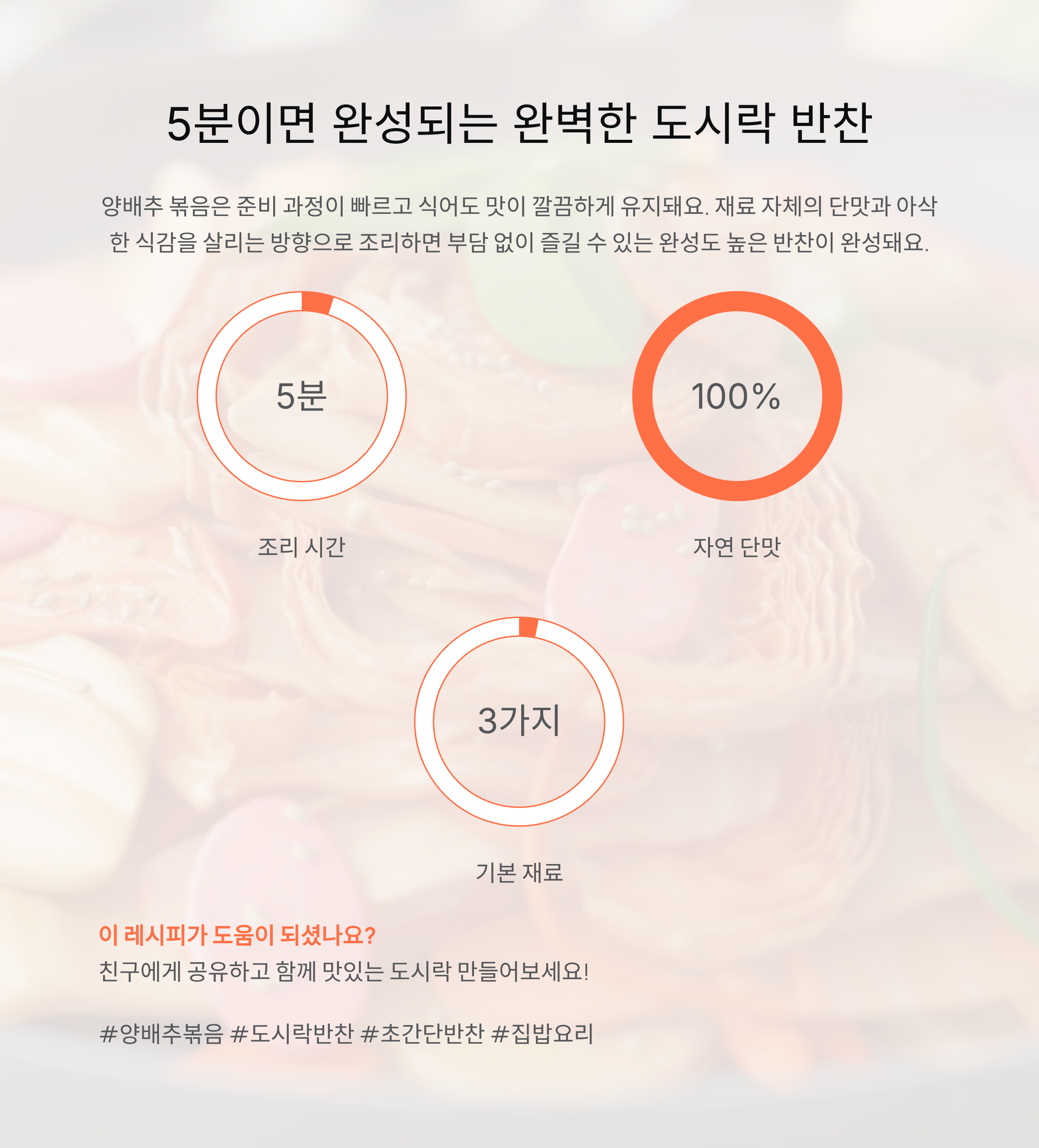 양배추는 조리 후에도 비교적 수분이 적게 나와 도시락에 넣어도 질척해지지 않아요. 또한 식어도 맛의 변화가 크지 않아 따로 데우지 않아도 부담 없이 즐길 수 있어요. 아침 시간에 빠르게 준비하기에도 부담이 없다는 점이 가장 큰 장점이에요.