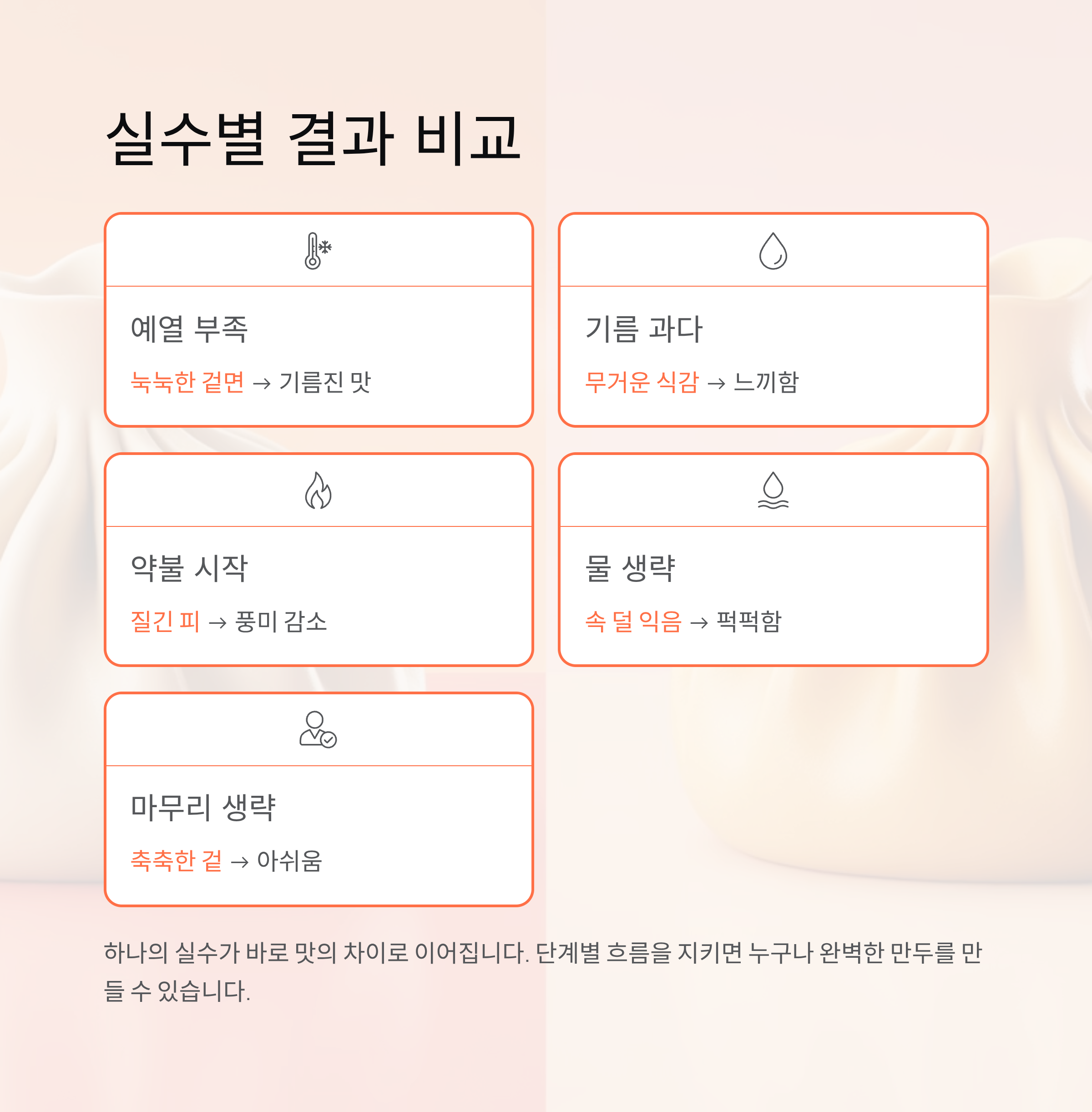 초보가 만두 굽기에 실패하는 이유는 복잡하지 않습니다. 예열 부족, 불 조절 미숙, 과정 생략이라는 몇 가지 실수가 반복되기 때문입니다. 이 실수들의 인과관계를 이해하면 만두 굽기는 더 이상 어려운 일이 아닙니다. 팬 앞에서 망설이지 않고 단계별 흐름을 지킨다면, 누구나 속은 촉촉하고 겉은 바삭한 만두를 완성할 수 있습니다.