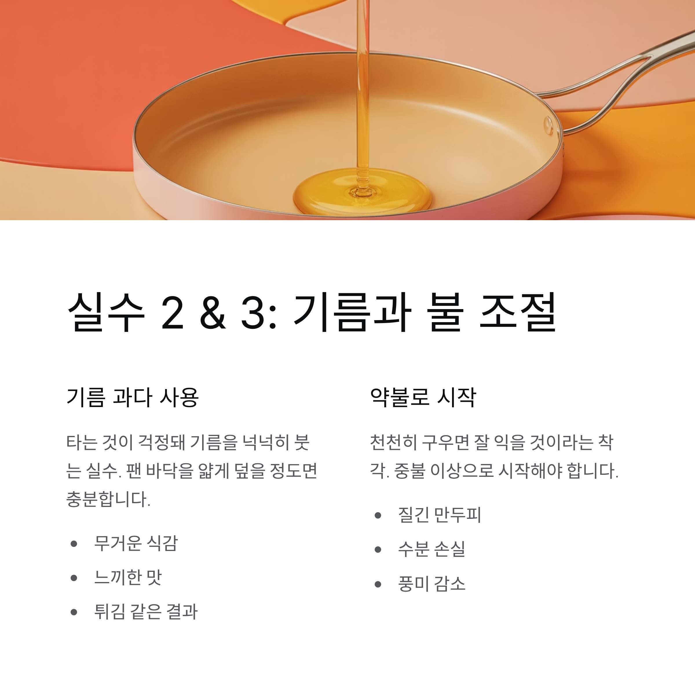 가장 흔한 실수는 팬을 충분히 달구지 않은 채 바로 만두를 올리는 것입니다. 팬이 차가운 상태에서는 만두피가 바로 익지 못하고 기름을 흡수하게 됩니다. 그 결과 겉은 바삭해지지 않고 눅눅한 식감이 됩니다. 예열은 시간을 늘리는 과정이 아니라 실패를 줄이는 과정입니다. 팬이 충분히 달궈진 상태에서 만두를 올려야 겉면이 빠르게 코팅되어 바삭함이 형성됩니다.