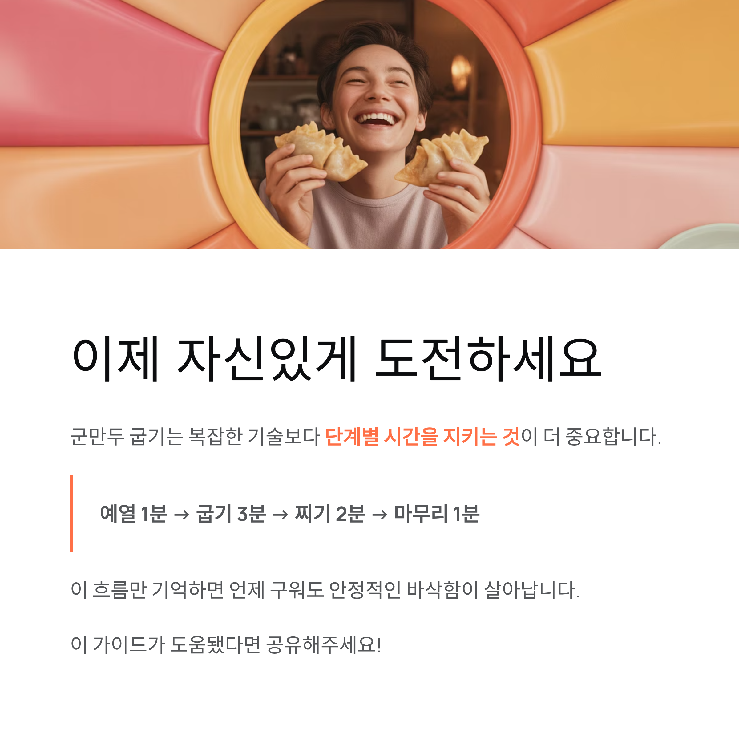 군만두 굽기는 복잡한 기술보다 단계별 시간을 지키는 것이 더 중요합니다. 예열 1분, 굽기 3분, 찌기 2분, 마무리 1분이라는 흐름만 기억하면 언제 구워도 안정적인 바삭함이 살아납니다. 초보자도 이 방식대로 따라 하면 자신 있게 군만두를 완성할 수 있을 거예요.