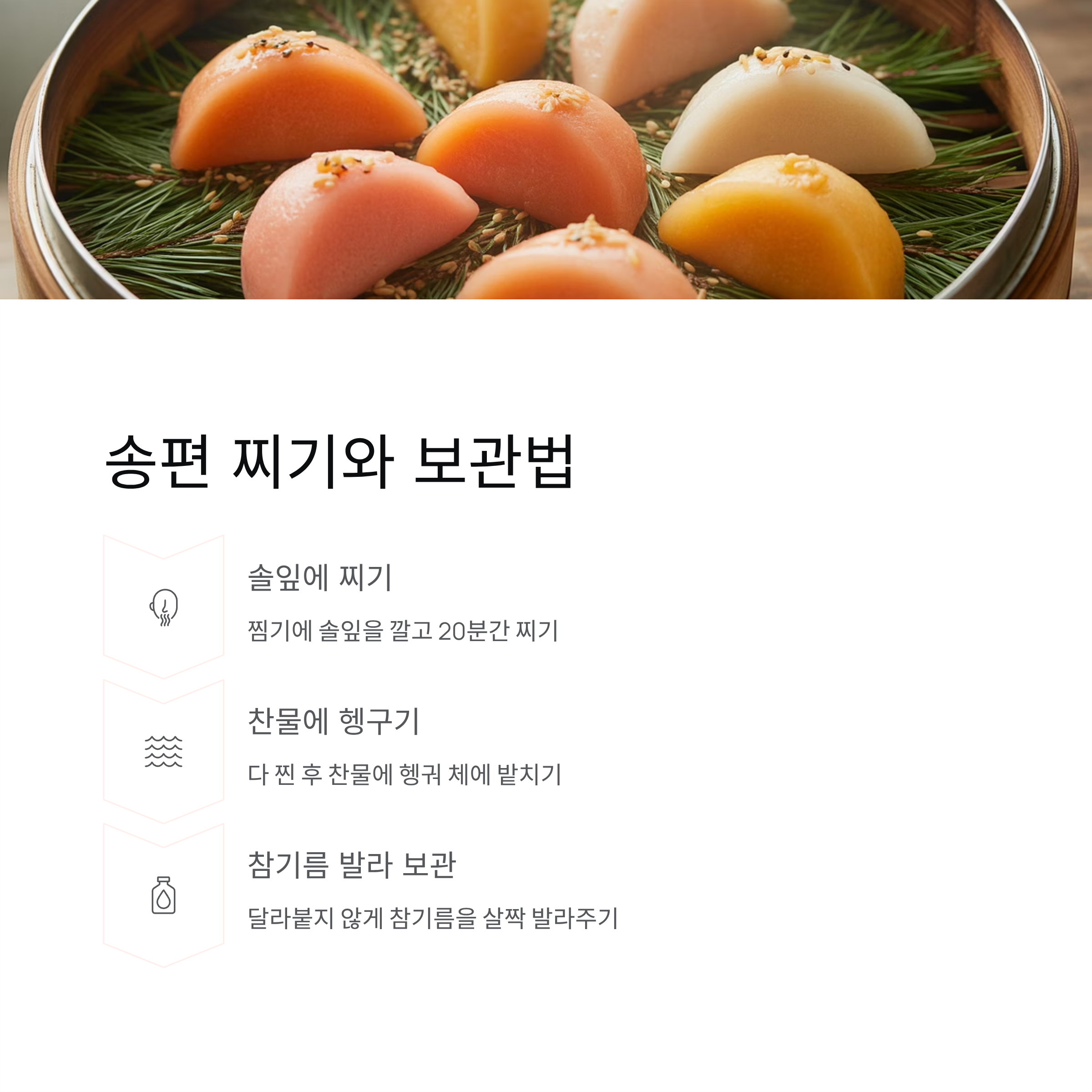 남은 송편은 냉동 보관이 가능하며, 먹을 때는 찜기에 다시 쪄내거나 팬에 구워 먹으면 새로운 맛을 즐길 수 있습니다.
