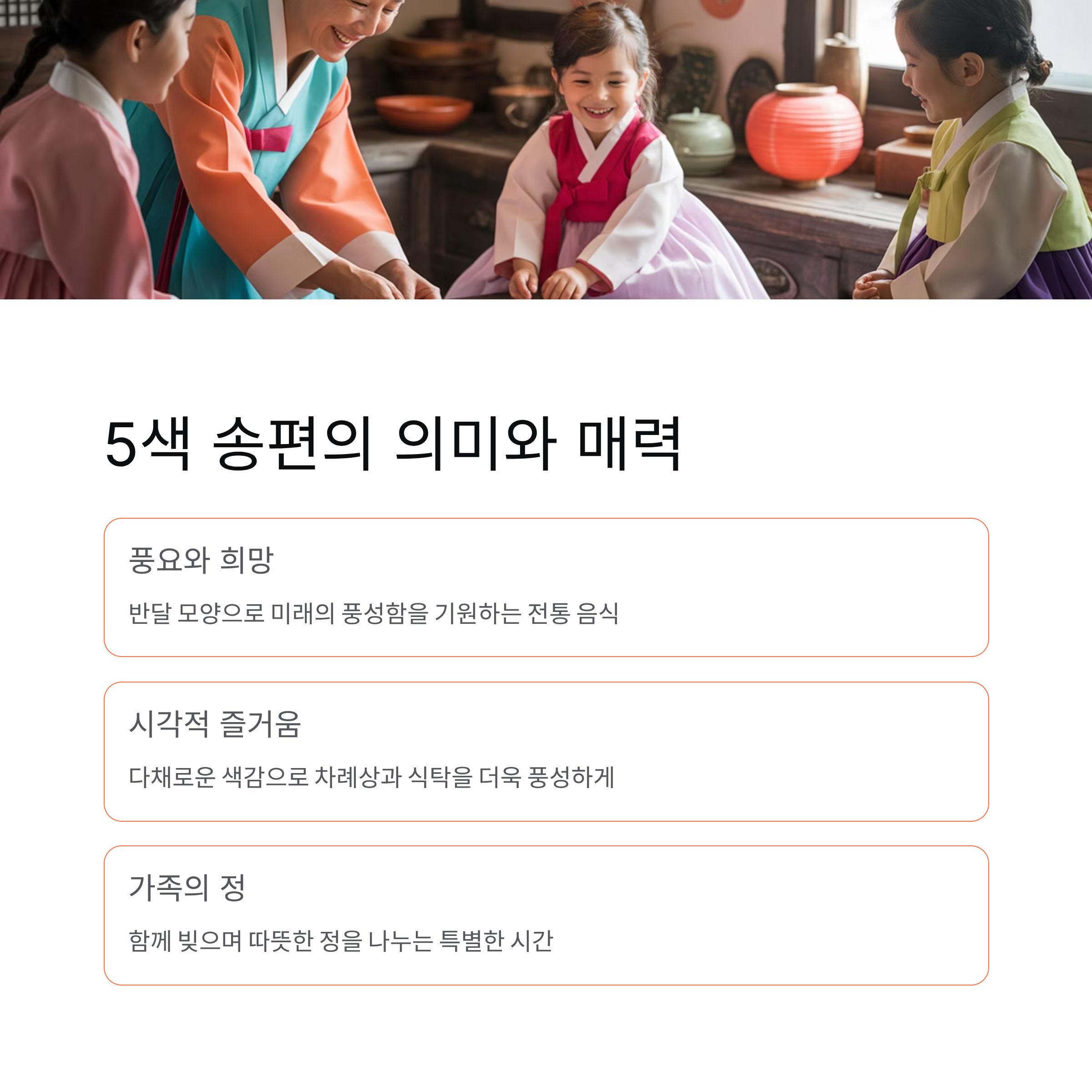 정성과 손맛이 담긴 5색 송편은 한 해의 풍요와 행복을 기원하는 가장 아름다운 방법이 될 것입니다.