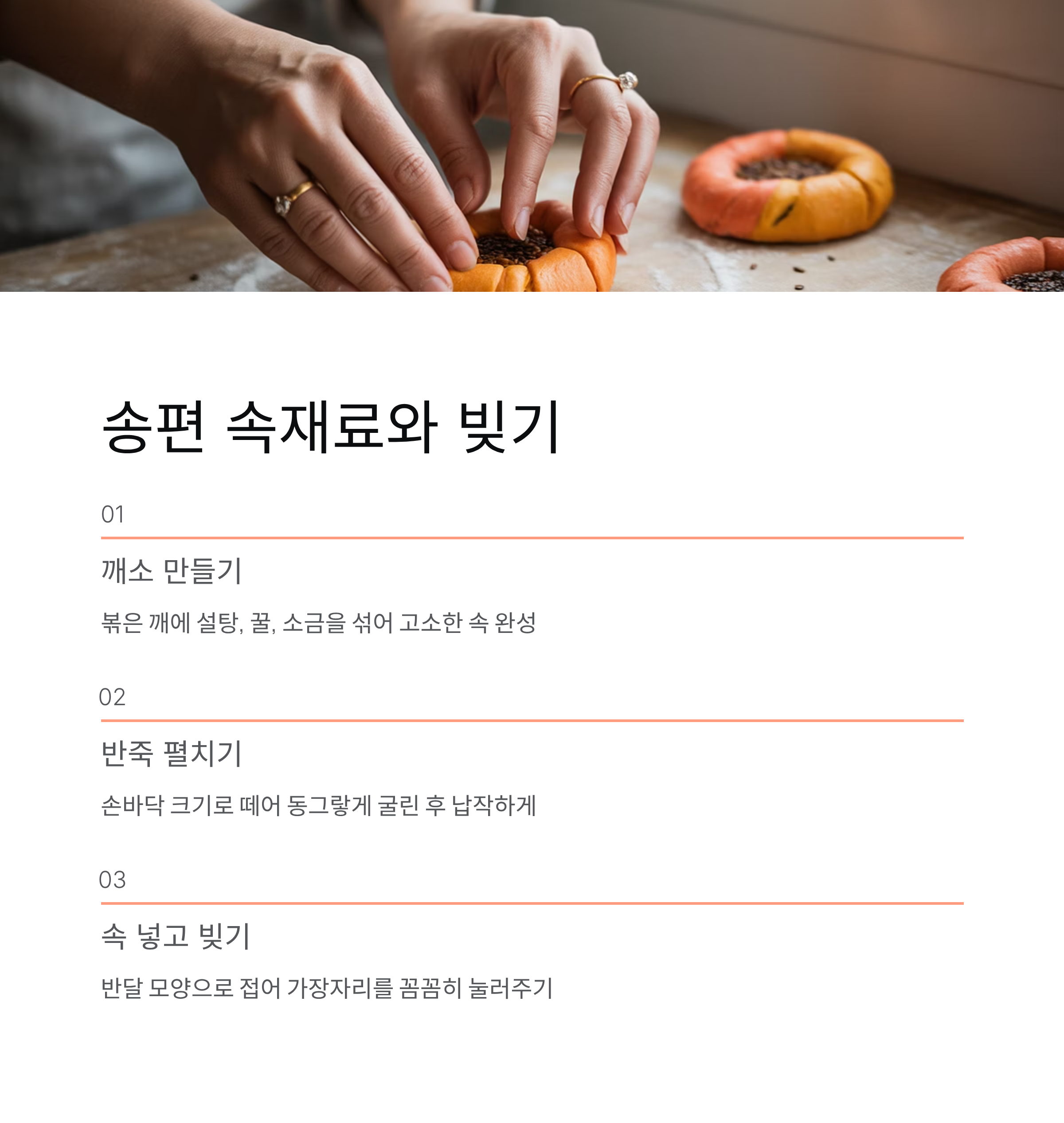 반달 모양으로 빚어 미래의 풍성함을 기원하고, 솔잎 향을 더해 조상께 감사의 마음을 담았습니다.